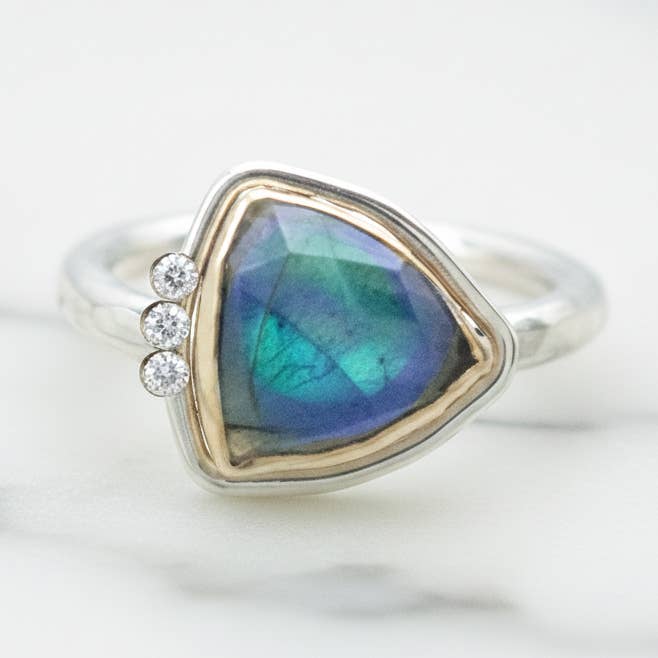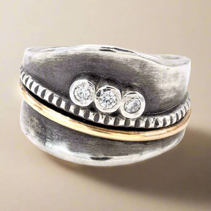 This ring rests comfortably on the finger. The flat wide hammered band of silver is wrapped in a length of gold fill wire around the central point of the band. Simple in its presentation, this ring none-the-less exudes class and refinement. Ring measure 3/8" wide