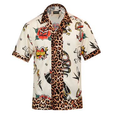 Our classic Tattoo print finally makes it's way on our bowling shirt! Black shirt with vintage tattoo flash on a tea colored background. Don't forget to add the Skull picture buttons! COLOR: Black with sublimated panels MATERIAL: 100% Polyester Machine Wash Cold, Tumble Dry Low Made in the USA