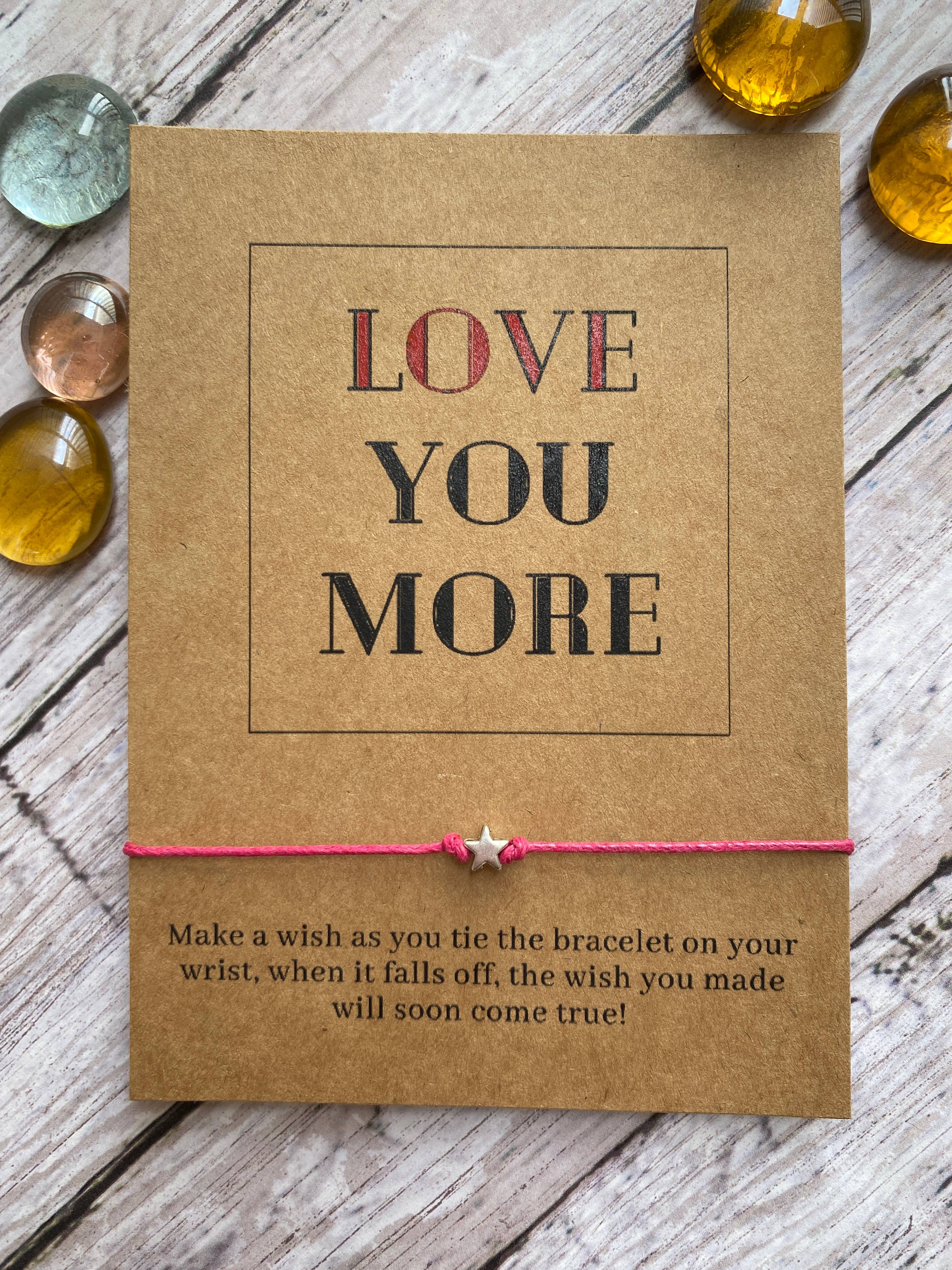Handmaid wish bracelet with a beautiful massage, perfect for gifting to someone special, includes a 1mm cord bracelet, each with a silver star charm. Massage is printed on a high-quality kraft card and presented in a clear cellophane sleeve, The string bracelet is approximately 12" in length and the card is about 4.5"x3.5". This is a tie-on bracelet.