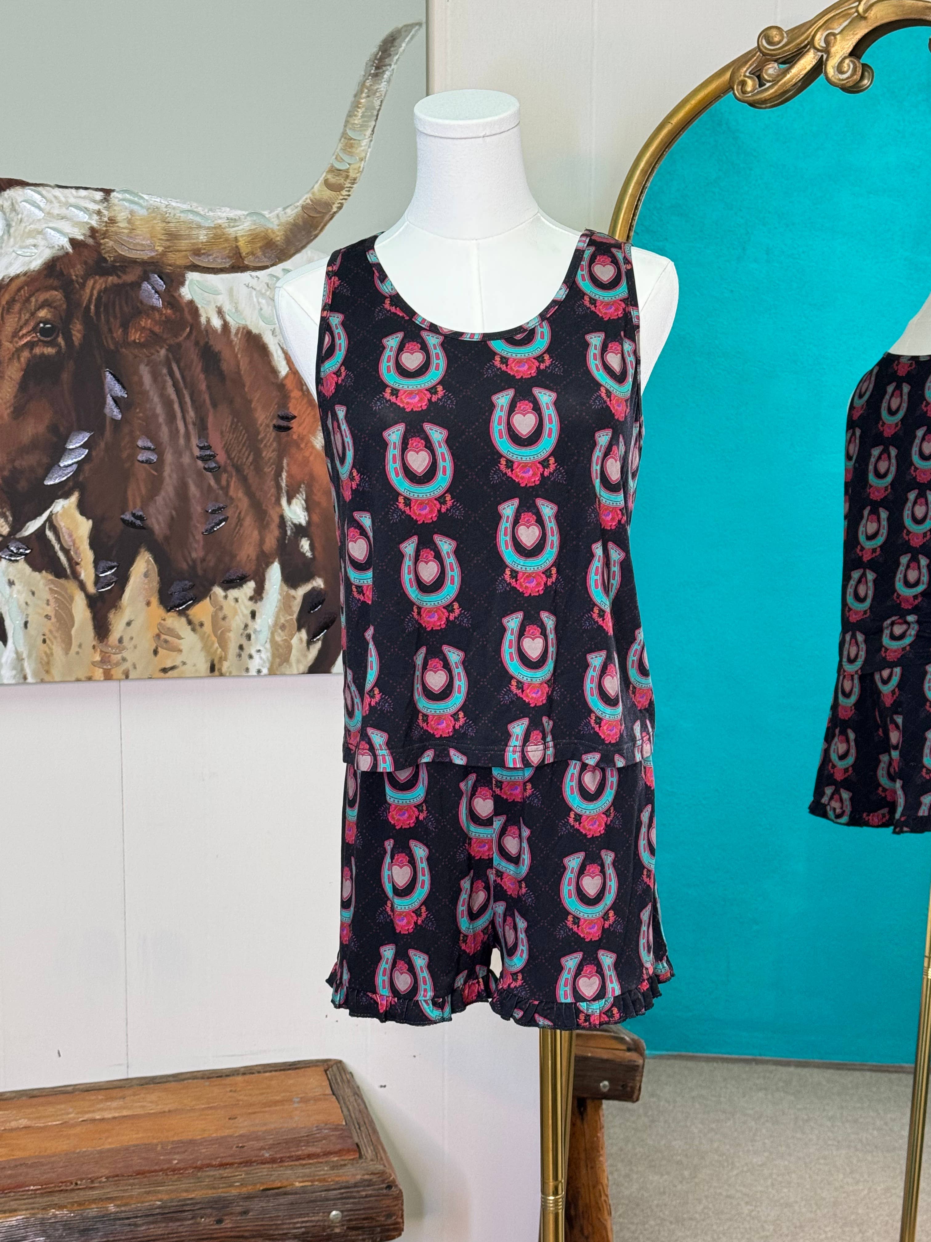 The softest! Tank and elastic waist shorts with ruffle hem. Matching robe/kimono available. Perfect for Valentine's or any time! 95% modal and 5% spandex.