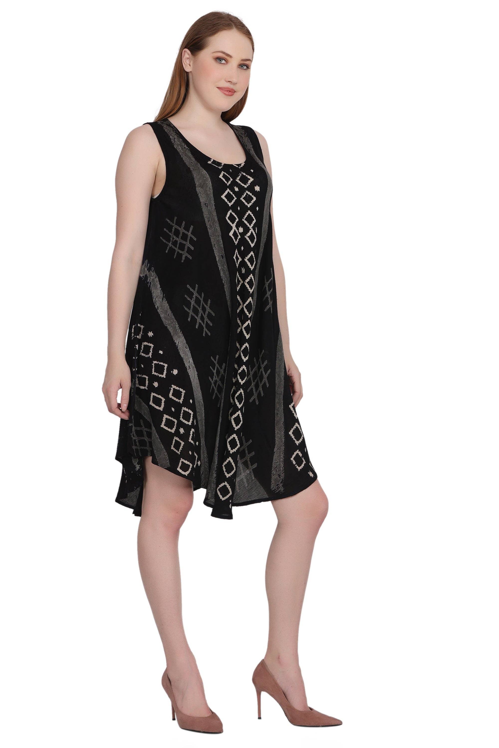 A thigh-length, tie-dyed dress with shaped sleeves and a shaped hemline. An unexpected combination of hunter green, bright turquoise, burnt rust and amethyst create an ultra unique look. 5% Spandex 95% Rayon - Made-in-India. Available in 6 colors.