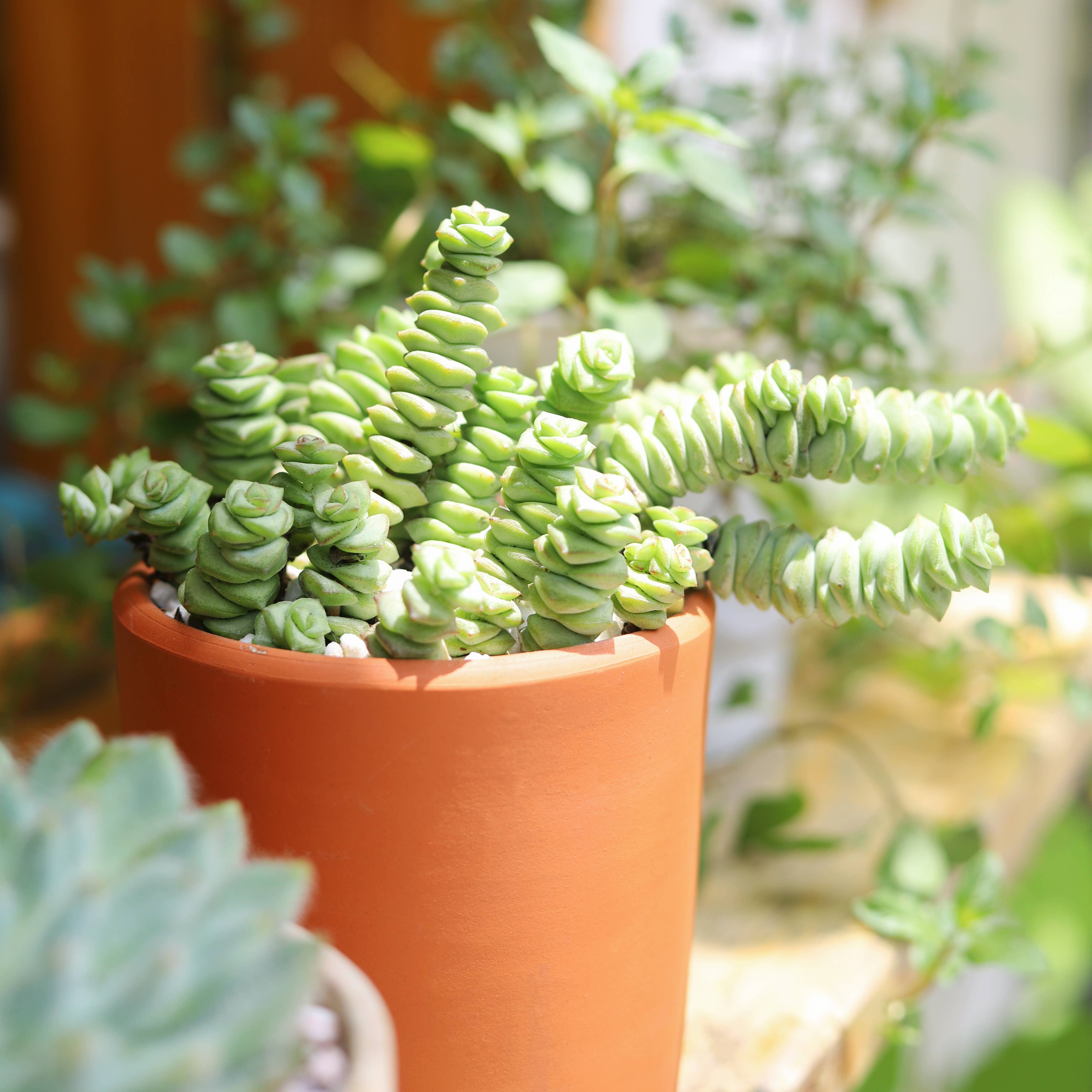 Our beautiful rooted Crassula Red Pagoda Shark Tooth is available in 2/4 inch size. Crassula Red Pagoda, also known as Crassula Shark Tooth, is a fascinating succulent with pointed triangular leaves that are densely packed like origami. With maximum sun exposure, the foliage can turn from dark green to striking light yellow with red tips. Edgy and unique, this succulent is a great addition to any planter or rock garden. It can be grown as a small-scale groundcover, or on hanging basket due to its branching habit. In summer, it produces small starry white flowers.Some specimens are redder than others. The more sun you give it, the redder it gets. ‘Red Pagoda’s’ color is brightest in winter in response to short, cool nights and bright sunlight. Light/Soil/Water: + Full sun to partial shade. + Well-Drained, Porous, Gritty. Optimal pH is around 6.0 (slightly acidic). + Water thoroughly when soil is dry to the touch, then let drain completely.