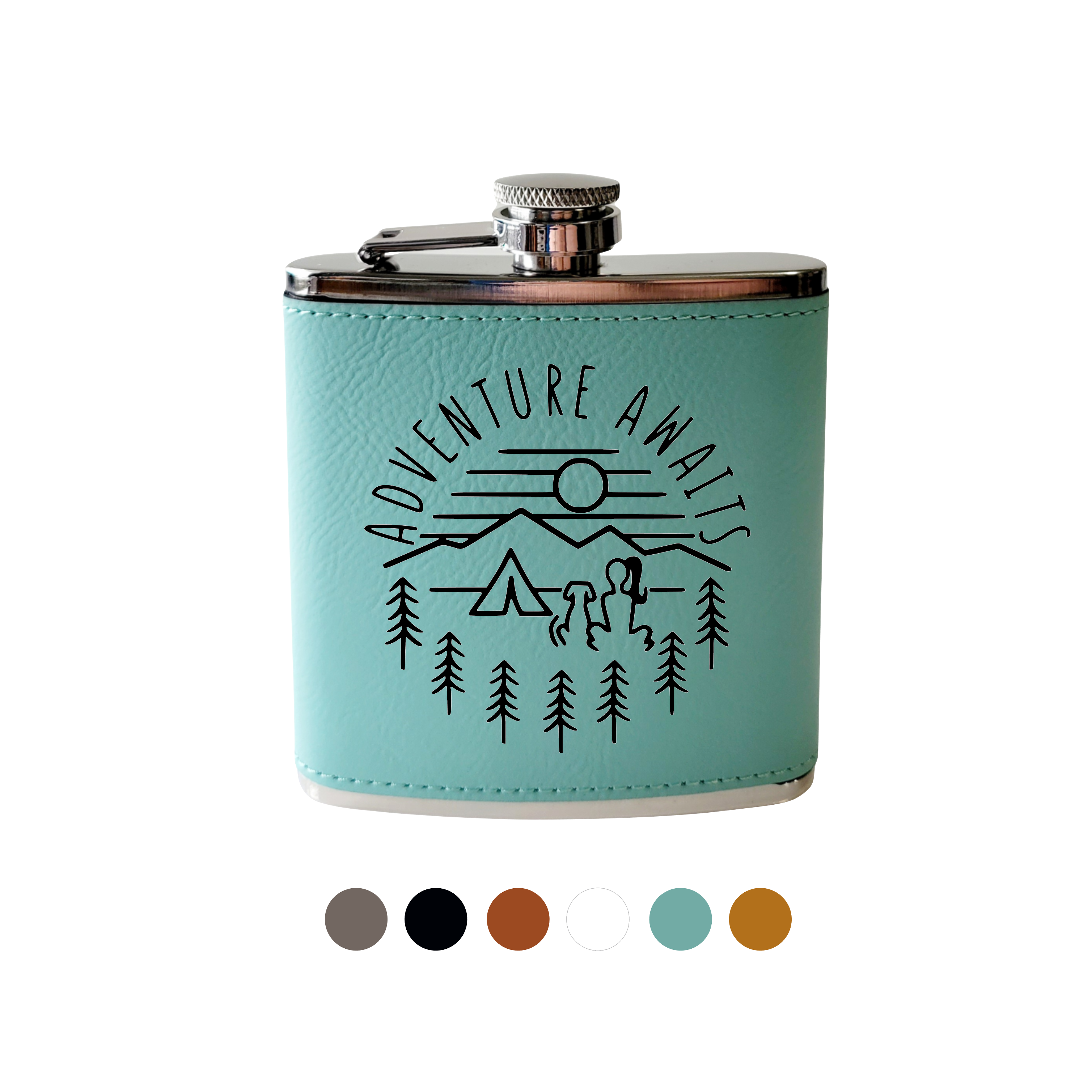 Flasks are a fun way to carry 6 shots of your favorite drink. Each flask is constructed of stainless steel and wrapped with a beautifully textured leather material cover OR durable powder coated finish. Both styles of flask feature a leak-proof lid and hold 6 ounces (Pro tip: 6 ounces=6 shots!). The slightly curved shape makes it comfortable to fit in any pocket! Each flask will come packed in a nice white box- perfect for gifting! To Order: 1. Select the finish (Leather or Powder coated) 2. Select the color: Leather flask options- Grey, Rawhide Brown, Wood Grain, Teal Powder coated options- Black, White Our Process: We laser engrave everything we sell. When an item is laser engraved it's ensuring the highest quality and guarantees a durability and precision that you can't get with other methods of design and creation. The image/wording will not peel, chip, or fade. It is permanently engraved into the surface of each product. Care Instructions: Hand wash with soap and water