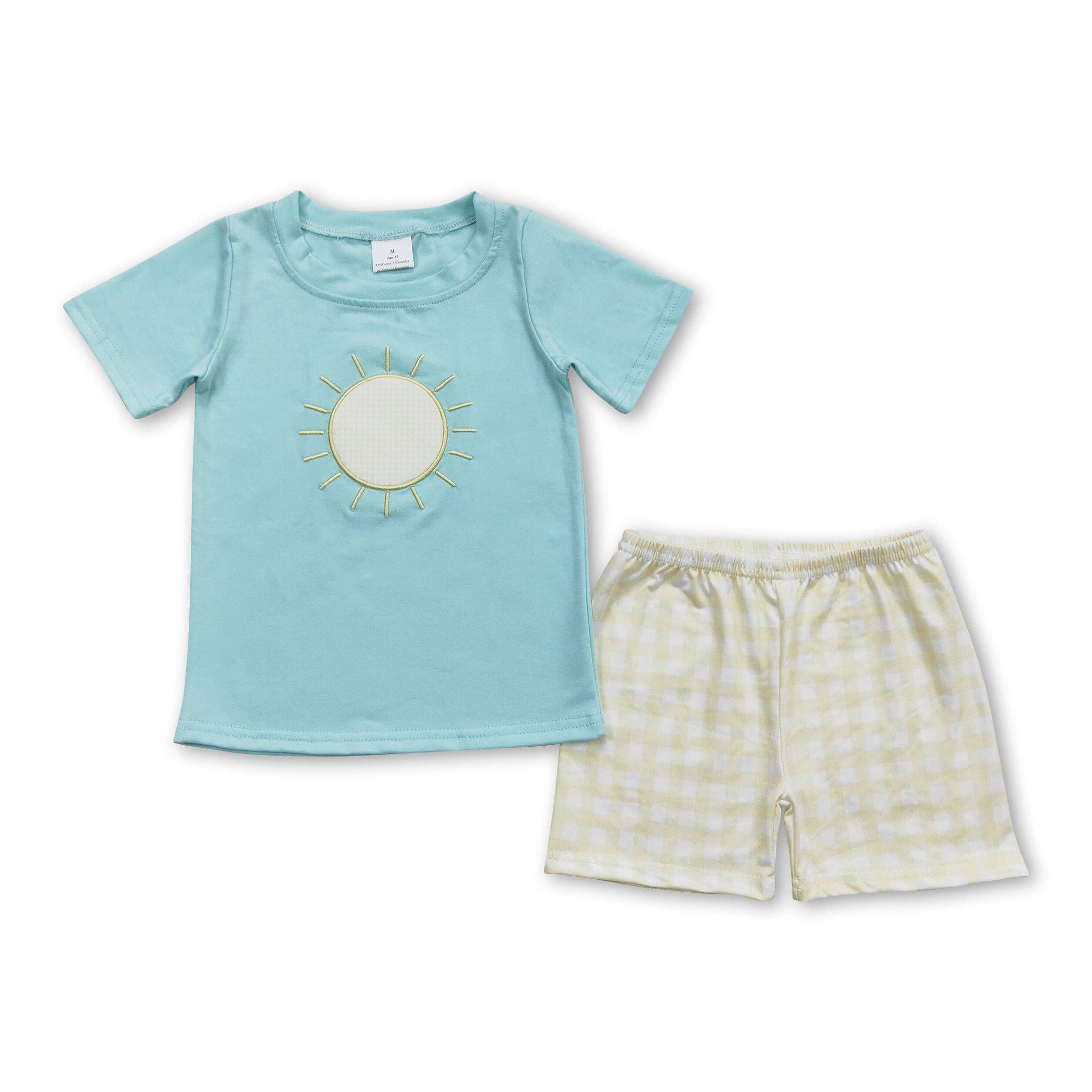 - Stripe print jersey - Crop top and shorts 2piece set - Round neck and short sleeves - Elasticized waist band with spaghetti strap - Ruffle trim hem on shorts