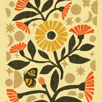 Sun snake is here to add some warmth to your days! Reproduced from an original paper cutout illustration. 8x10”. Sized for a standard frame.