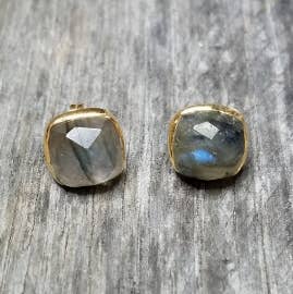 Beautiful 8mm custom cut faceted gemstone stud earrings set in 14K Goldfill settings and posts. Available in Black Spinel, Crystal Quartz, Green Onyx, and Labradorite. Handmade in California.