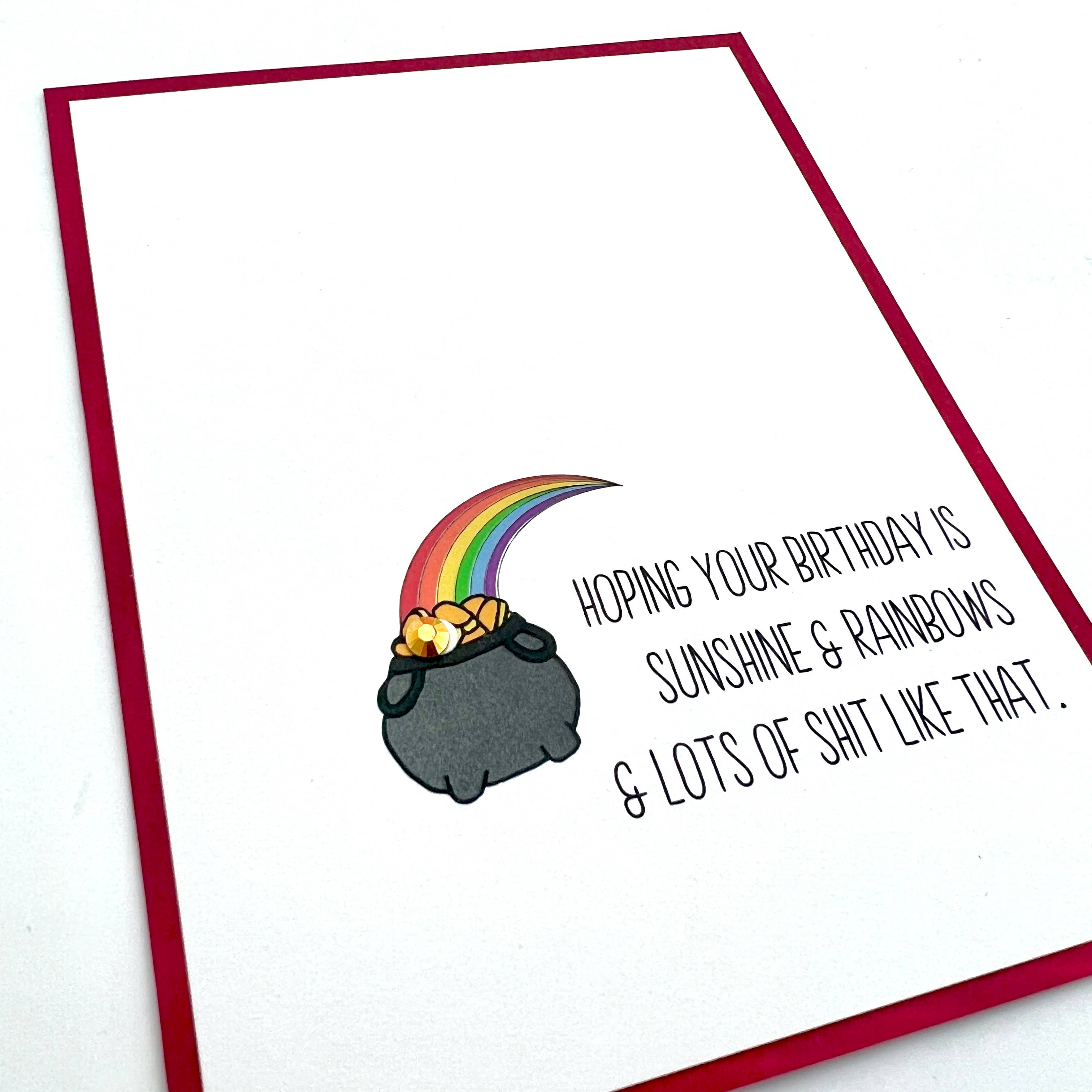 Happy fucking birthday with sprinkles on top. Sugary birthdays are divine. Each card is handmade with high-quality acid-free cardstock using laser-printing, archival adhesive, and embellishments. Cards are all blank inside and are shipped with a recycled envelope in an eco plant-based cellophane sleeve. Card size 4.25 in x 5.5 in a2 Envelope color recycled kraft brown Envelope size 4.375 in x 5.75 in a2 Material paper Inside blank