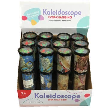 This beautiful 6-inch glitter wand kaleidoscope toy from Toysmith brings the magic of the rainbow to life. A liquid-filled glitter wand is secured to one end of the kaleidoscope. Hold the scope until the wand is vertical, put your eye to the other end, and then move the scope around to create a colorful show. Glitter kaleidoscopes come in an array of vibrant glittery colors and metallic foil-like exteriors. The scope and glitter wand colors match for a vibrant combination. Colors vary in provided assortment but may include red, green, blue, purple, silver, or gold. Blue display case with multicolored designs holds 12 assorted glitter wand kaleidoscopes. • Age Grade: 5+ • Product Dimensions/Weight: 5.1 L x 1.4 W x 6.0 H / 0.2 lb • Inner Pack Dimensions/Weight: 10.9 L x 9.0 W x 6.4 H / 3.3 lb • Made In: Taiwan • Batteries not required