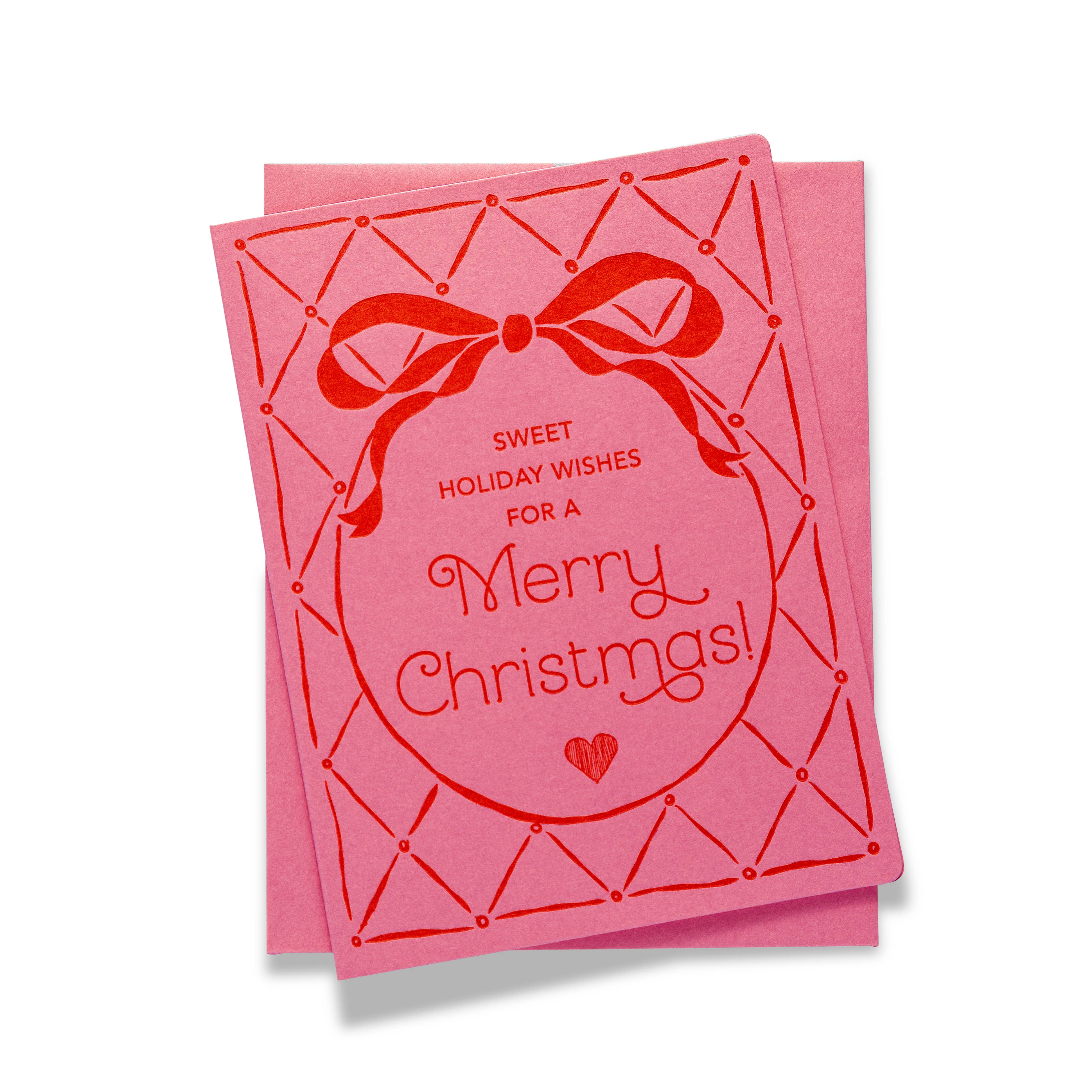 Category: Christmas. Format: A2, (4.25 x 5.5). Material: 120lb Mohawk Ultra White Superfine. Process: Full Color. Features: Blank Inside. Colors: Pink. Red. White. Envelope: Bright Red.