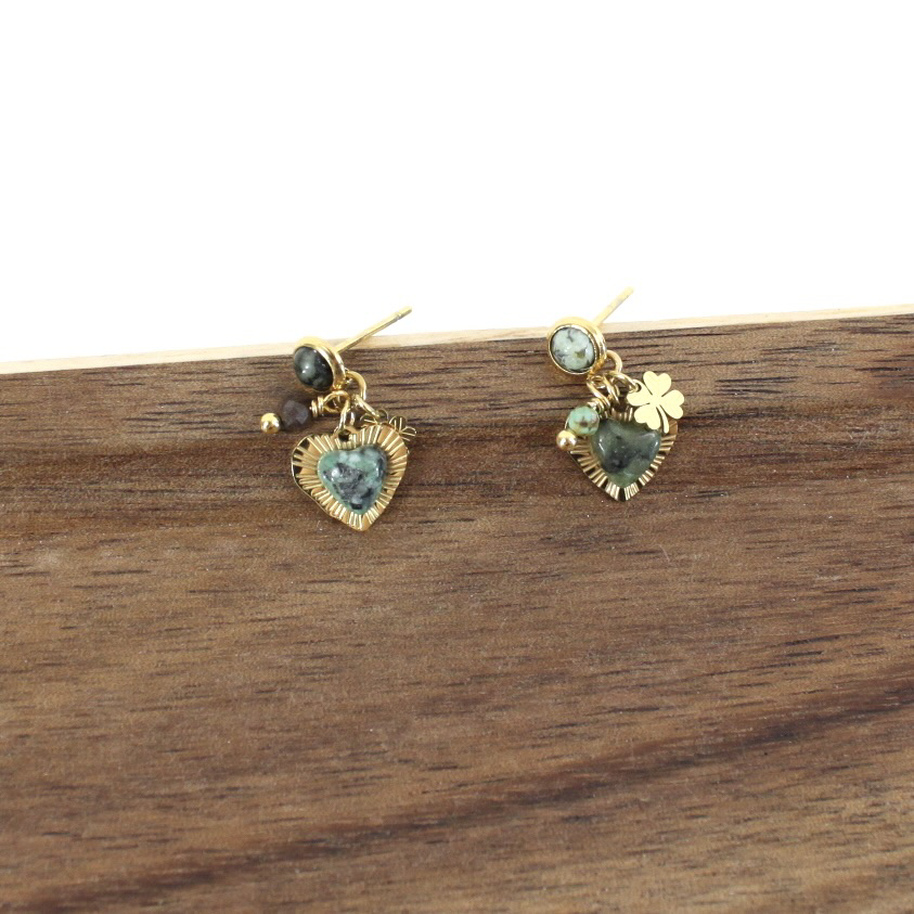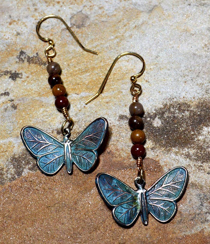 Love, love, love!!! Can’t get enough love in the world! This is great pair of earrings with a long wire, a pop of turquoise, gold crystals & and a hammered Brass Heart. Turquoise Jasper is said to help find inner peace and release stress. They appear bright turquoise in color. Metal: Brass Size: Approx 2” Handmade with Art & Soul