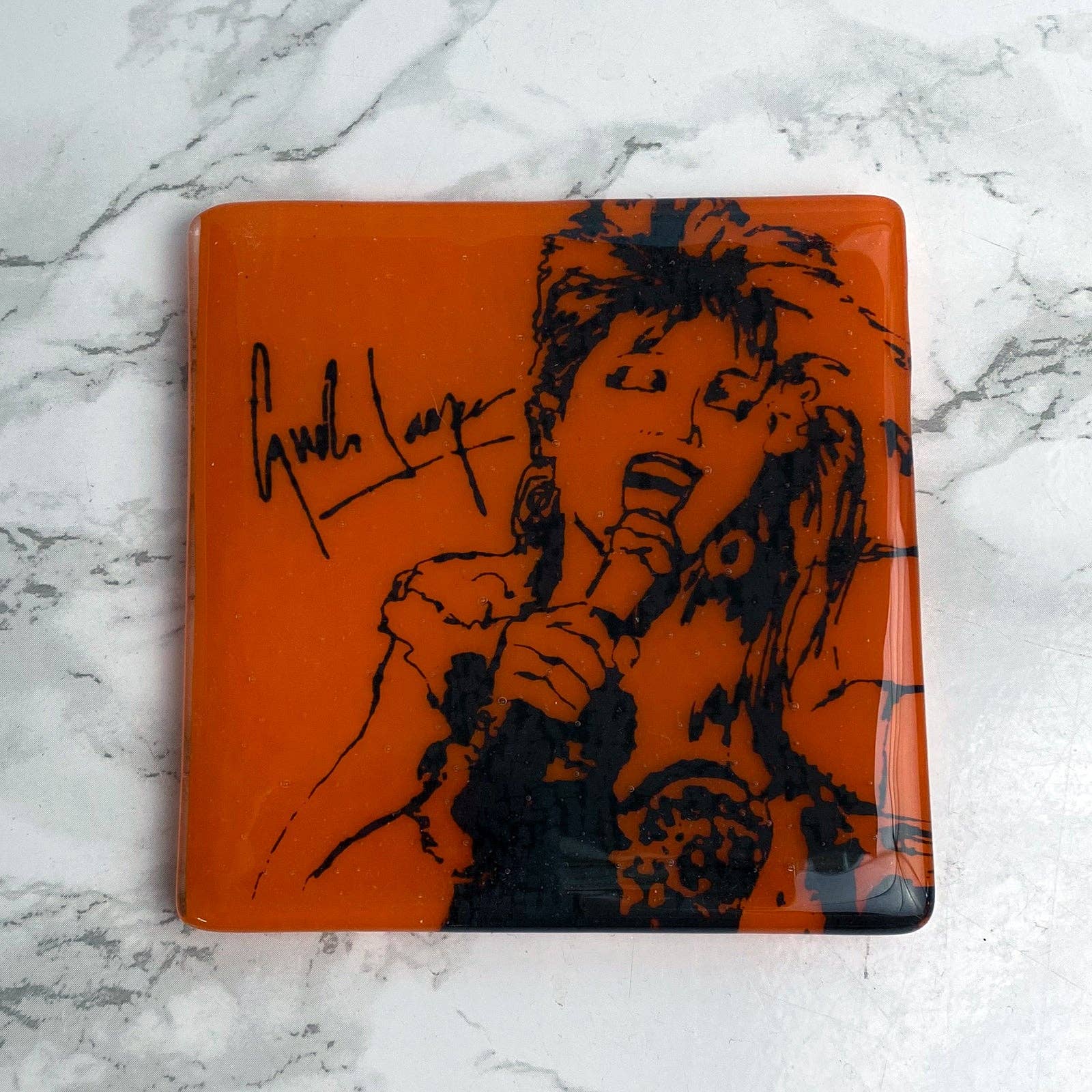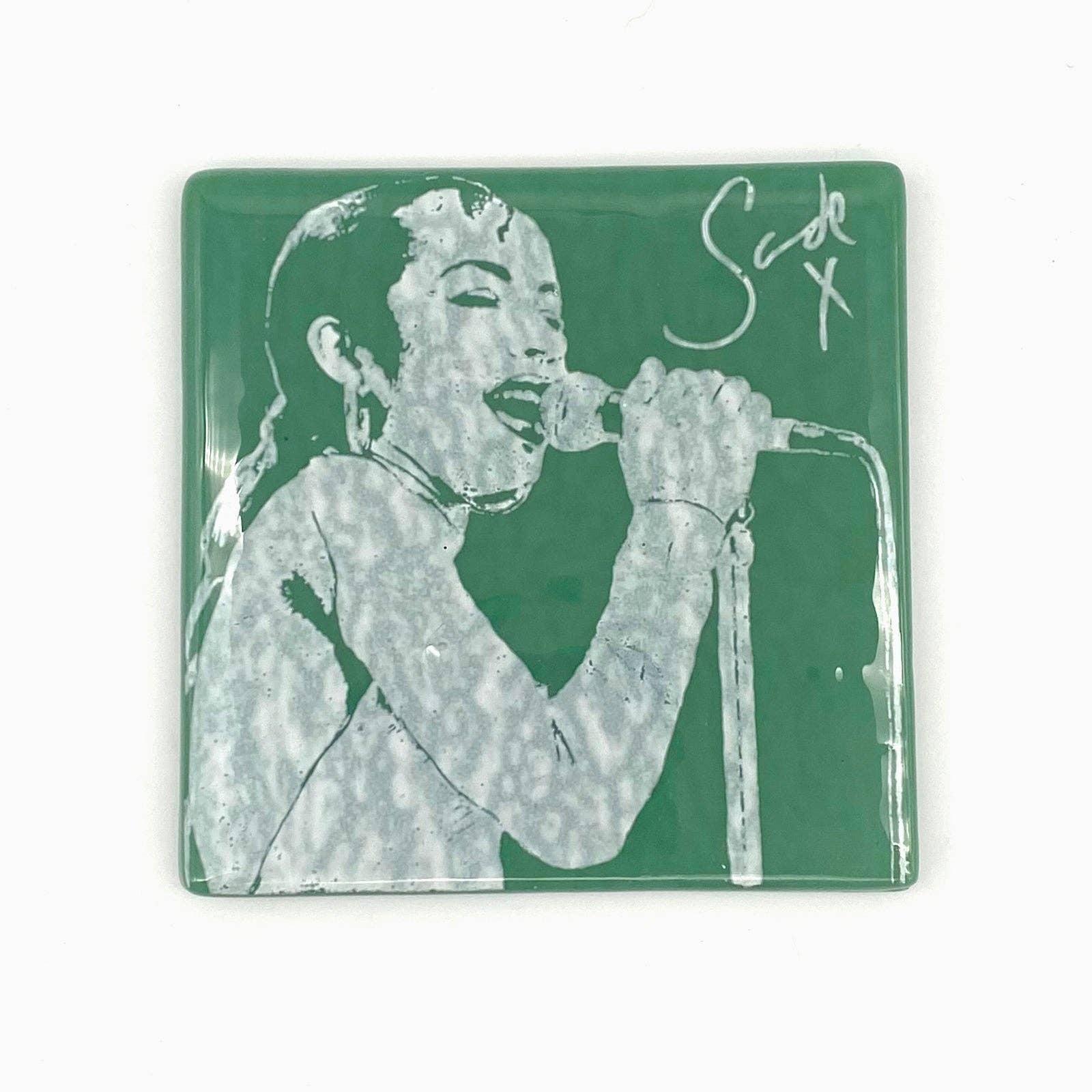 This coaster features R&B legend Etta James. Multi-functional little art pieces make great gifts, and are a great size (and price) for buyers. * Transparent aqua glass, printed in black glass enamel * 4" square, with rubber bumpons on bottom * Dishwasher safe * Handmade in the USA Coasters are screen printed, fused glass. Glass is cut, and screen printed by hand with fine glass enamels, then fused overnight to 1415 degrees in a kiln. Each piece is made by artist Laurie Freivogel in her Oak Park studio.