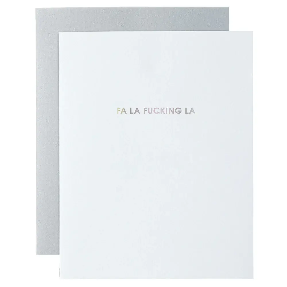 Our “Jingle Hell, Mingle Hell, In-Laws on the Way” card is letterpress printed on a vintage printing press in sunny California. Featuring bold black ink with a blind impression design and paired with a festive red envelope, it’s the perfect holiday card for anyone who knows family gatherings can be… a lot. Details: • Letterpress printed on tree free paper • Black ink + blind impression with red envelope • Size: 5.5” x 4.25” • Folded card, blank inside • Sealed in a cello sleeve • Made in California Best for: • Funny holiday greetings • Relatable family moments • Friends and relatives with a sense of humor Merchandising Tip: Perfect for holiday humor displays. Pair with seasonal cocktail napkins, festive drinkware, or stocking stuffer gifts. Acrylic fixtures are available for purchase through Chez Gagné, including counter racks, 16-pocket spinners, and 48-pocket spinners—ideal for showcasing bestselling holiday cards.