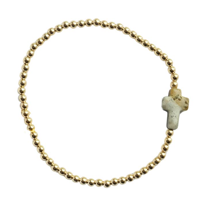 Stone cross beading will remind you to always hold faith! Each cross is unique in color and pattern. Blue Goldstone is a dark navy stone with sparkle flecks that make it look like a night sky. Genuine gemstone crosses each hold their own special meaning. Also available in Blue Spot Jasper, Tigers Eye, White Jade, Amethyst, and Rose Quartz. 7" / 3mm 14k gold filled beads / on stretch string for ease Swim, play, live in these tarnish free bracelets! Listing is for one bracelet.