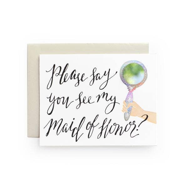 Please say you see my bridesmaid? - A perfectly sweet way to ask someone to be your bridesmaid. Adorable (real glass) 1 inch mirror surrounded by a holographic foil frame. • Card size is A2 (4.25"x5.5") • 100% recycled card stock • Blank inside • Letterpress printed in Chico, California