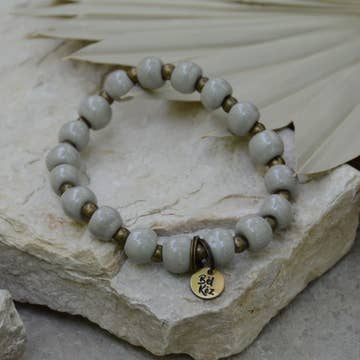 Raw clay sourced in the central plateau region in Haiti is processed + individually hand rolled by talented artisans in Port-au-Prince, Haiti - transformed into beautiful ceramic jewelry. * Handmade in Haiti * Glazed, kiln fired clay beads on elastic * Approximately 7” diameter * Antique brass spacer beads * Inspirational antique brass hand-stamped charm {25mm circle OR 12mm hexagon} Single bracelet listing || some photos shown in stacks Light Grey | Grey