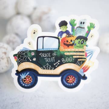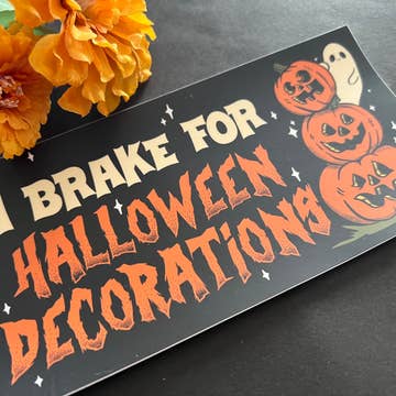 9x3 inch bumper sticker of a car abruptly stopping in front of a home decked out for halloween! Nice! Waterproof Glossy finish
