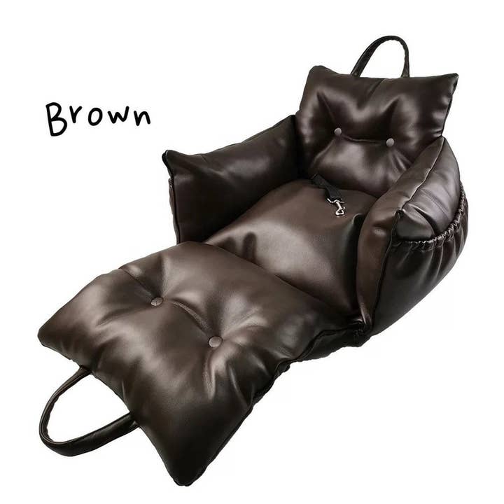 Dimension: Lx Wx H: Outside: 43cm x35cm x 20cm (33cm) , Approx. 17in x 14in x 8in (13in) The maximum length of the strap that will be attached to the seat of your car is 40in, 102cm. Recommend Weight: I recommend it for pets under 15 lbs. Please refer to the dimension or message me about the back length of your pet. The dog you see in the picture is 14lbs with a 12in back length. Material: Three types of fabric: -Brown, faux leather(waterproof, hair resistant) , -Light Gray, fabric texture (water-resistant), -Dark Gray, sofa cloth(Chenille fabric, indoor) Care: -Vacuum cleaning. -Lint roller to clean the pet fur &hair. -Simply clean with a damp cloth. Safety: -Safety and adjustable leash attached to the pet car seat, which keeps your pet stay in the car seat during driving. -the anti-slip bottom will make sure the car seat stays its way, so it won’t move around when you’re driving.