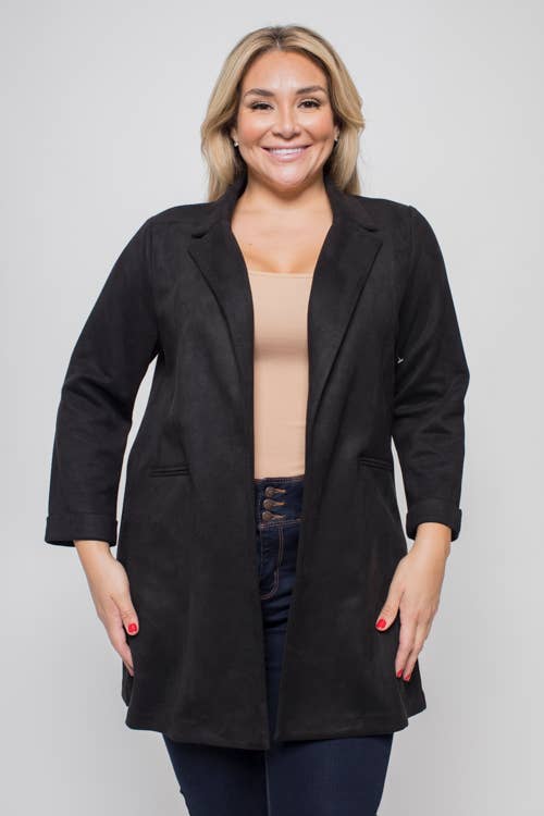 This soft stretch velvet blazer is boardroom ready yet perfect for a night out. Fitted shape and curved hemline flatter the figure - it's super easy to dress up or down. Slightly longer length in the back back provides coverage. - Stretch Velvet - Luxurious Black - 95% Polyester / 5% Spandex - Pockets