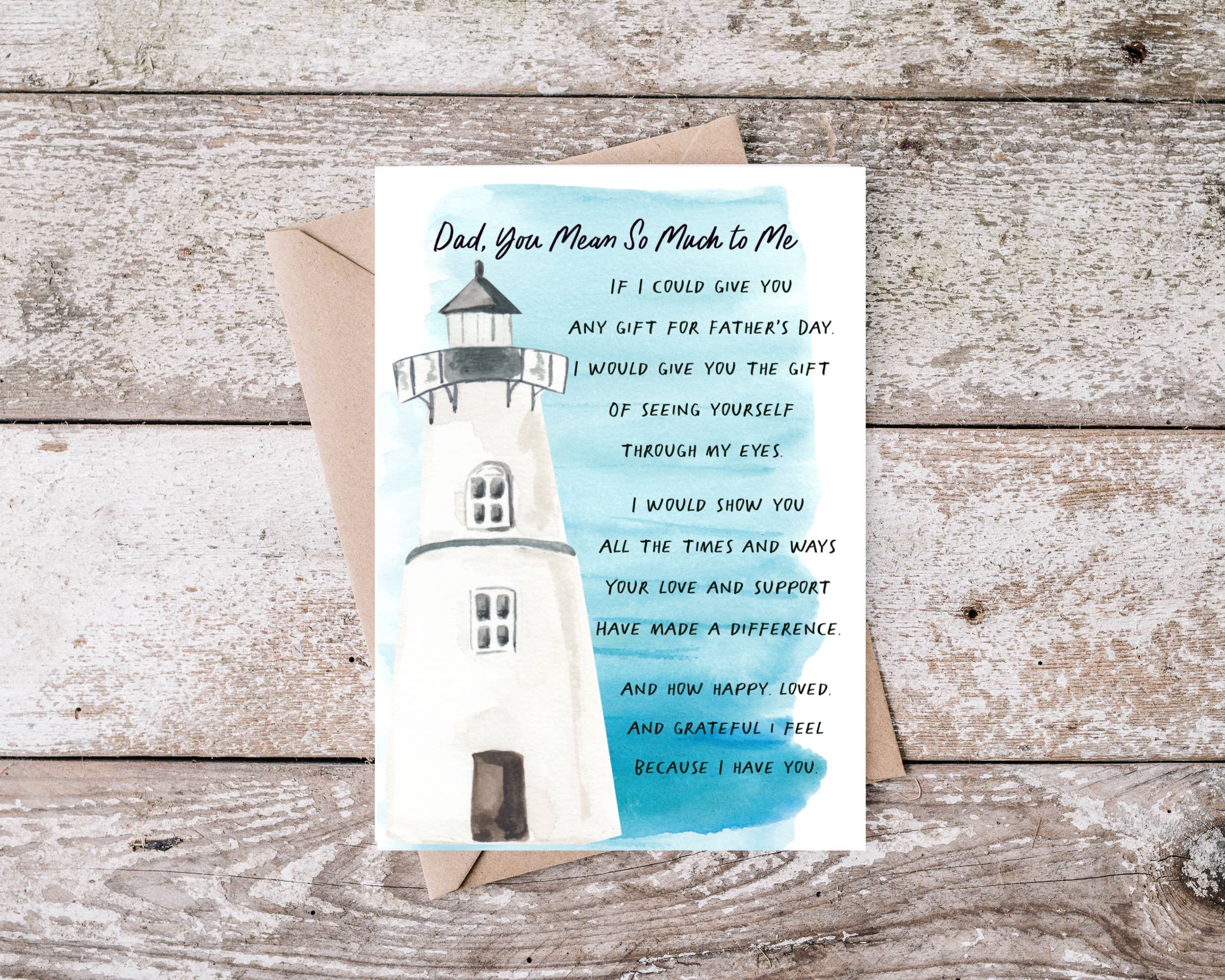 blank inside Dads teach us so much about life, and even more about love. Wish your dad a Happy Father’s Day with this heartfelt card that features a photograph of a stack of rocks at the beach. 5x7 folded card linen texture cardstock recycled brown Kraft envelope clear cello protective envelope