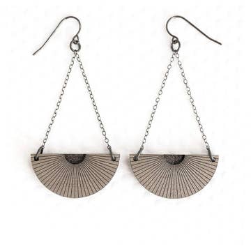 Two-layer half-circle chandeliers engraved on both sides with metallic fronts + natural wood backs. Measure 1 G” W and hang 2" with chain. Finished on french ear wires in oxidized silver.