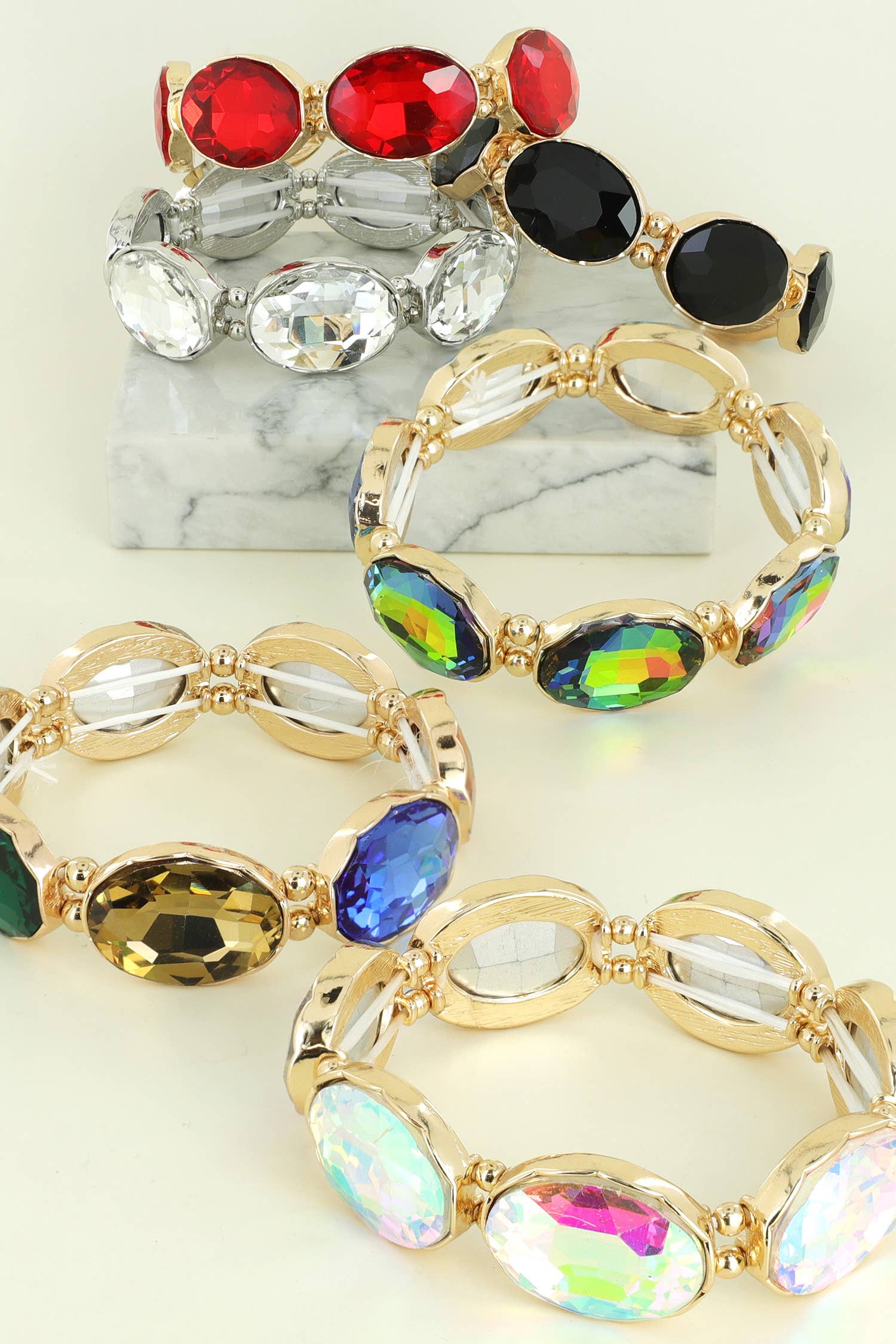 Wholesale Jeweled Golden Bangle - with Faceted glass oval colorful jewels