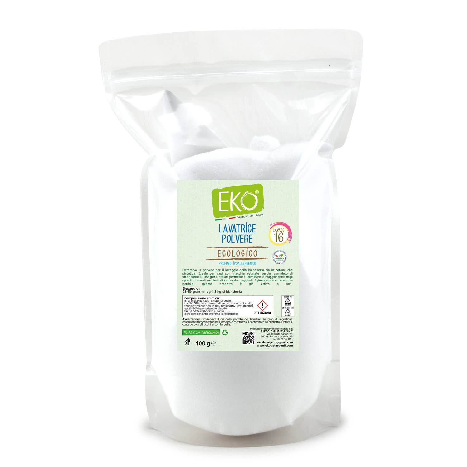 Eko ecological detergent for washing clothes in both cotton and synthetic. Ideal for garments with stubborn stains because it is enhanced with active oxygen bleach, therefore more effective on dirt and difficult stains even at low temperatures. Eko washing powder allows you to eliminate most of the dirt on fabrics without damaging them. The presence of active oxygen ensures complete hygiene and helps remove fungi and bacteria. The high softening power is achieved through the use of bentonite clay. The first enzyme-free washing powder, thoroughly washes your clothes without leaving marks or stains. Sanitizing and eco-compatible, this product is already active at 40°. * Product certified by the Biocertitalia Authority * Plant-based ingredients * Hypoallergenic fragrances * Product without EDTA, phosphates, enzymes, dyes, optical whiteners