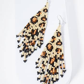 Enjoy a sophisticated Southwest look with these soft hued seed bead fringe earrings. Patterned in beads of cream, copper, and gray to reflect the natural elegance of the prairie landscape. Neutral is the new amazing. Glass round seed beads with tube bead bottom. 1 1/4" x 4 1/4". Silver-tone ear wire. Handmade in India.
