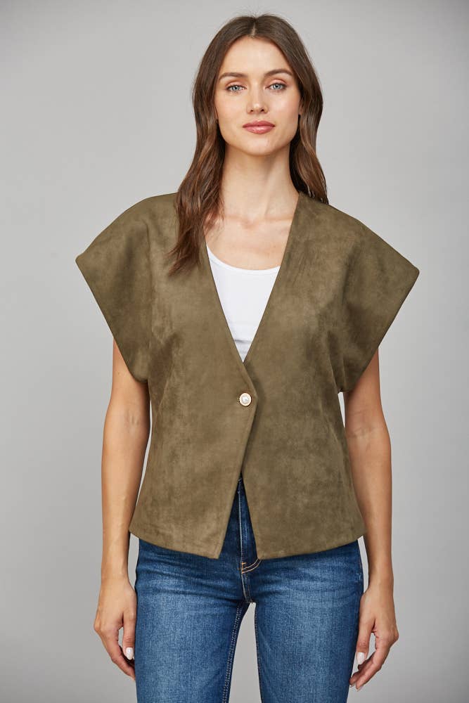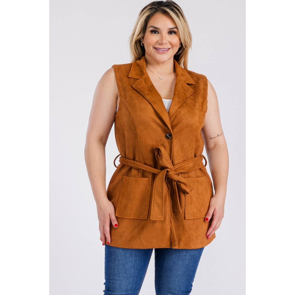 VEST WITH FULL LINING SELF: 97%POLYESTER 3%SPANDEX LINING:100% POLYESTER MEMORIAL BLAZER. VERY FASHIONABLE AND ADORABLE. 4TH OF JULY WAHSED DENIM SHACKET. EASY TO WEAR.