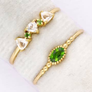 Our dainty & beautiful Emerald Green Ring is made with top-quality, genuine Green Quartz. Not to mention, the unique look of the whimsical vine ring setting will ensure endless compliments with this May birthstone ring. FEATURES Oval shaped, brilliant cut faceted genuine Green Quartz stone (6mm x 8mm) The vine ring setting is considered "heavy plating", which means it has a much thicker layer of rose gold, & gives the ring its long lasting luster *Ring does not come in box*