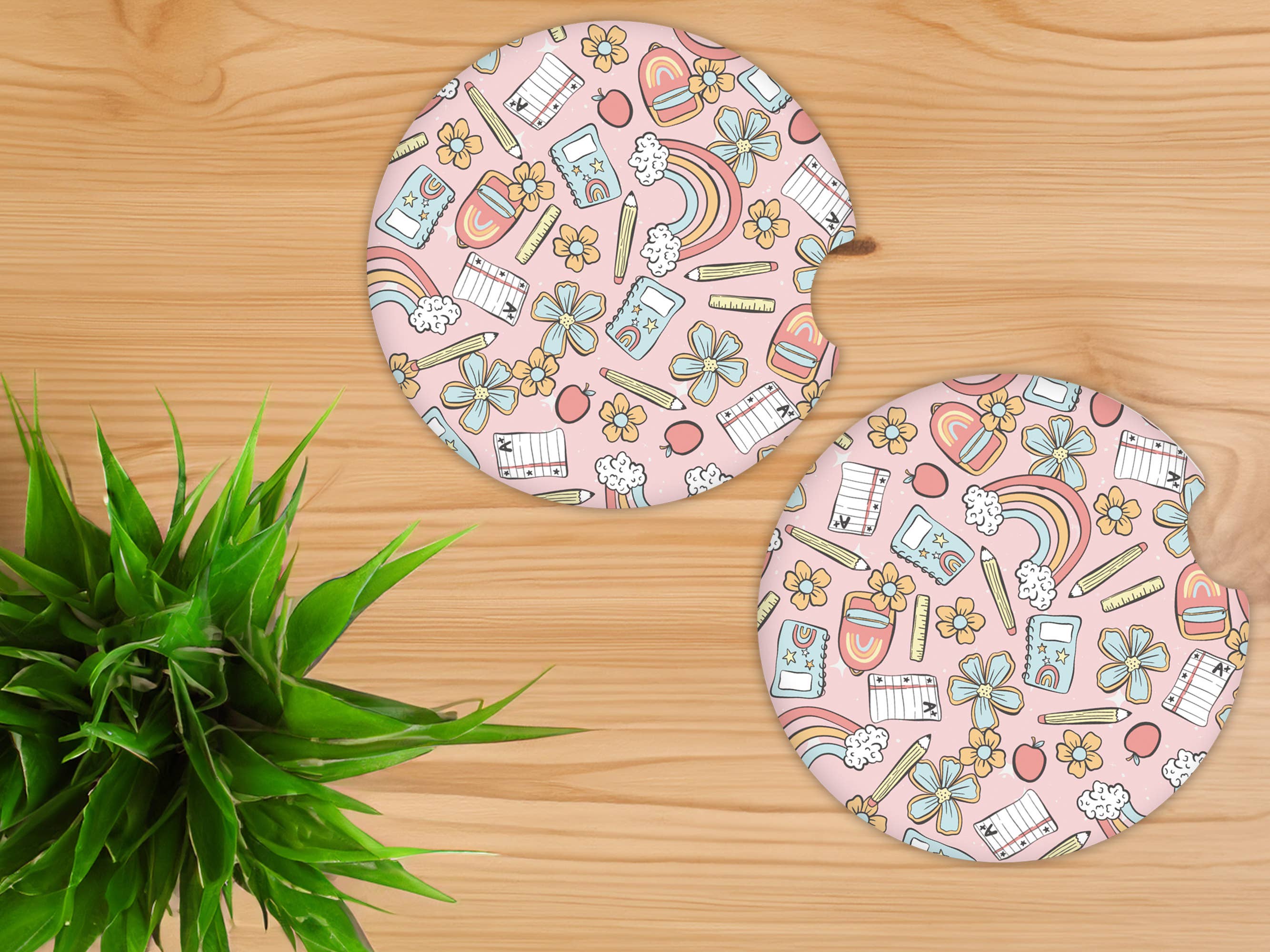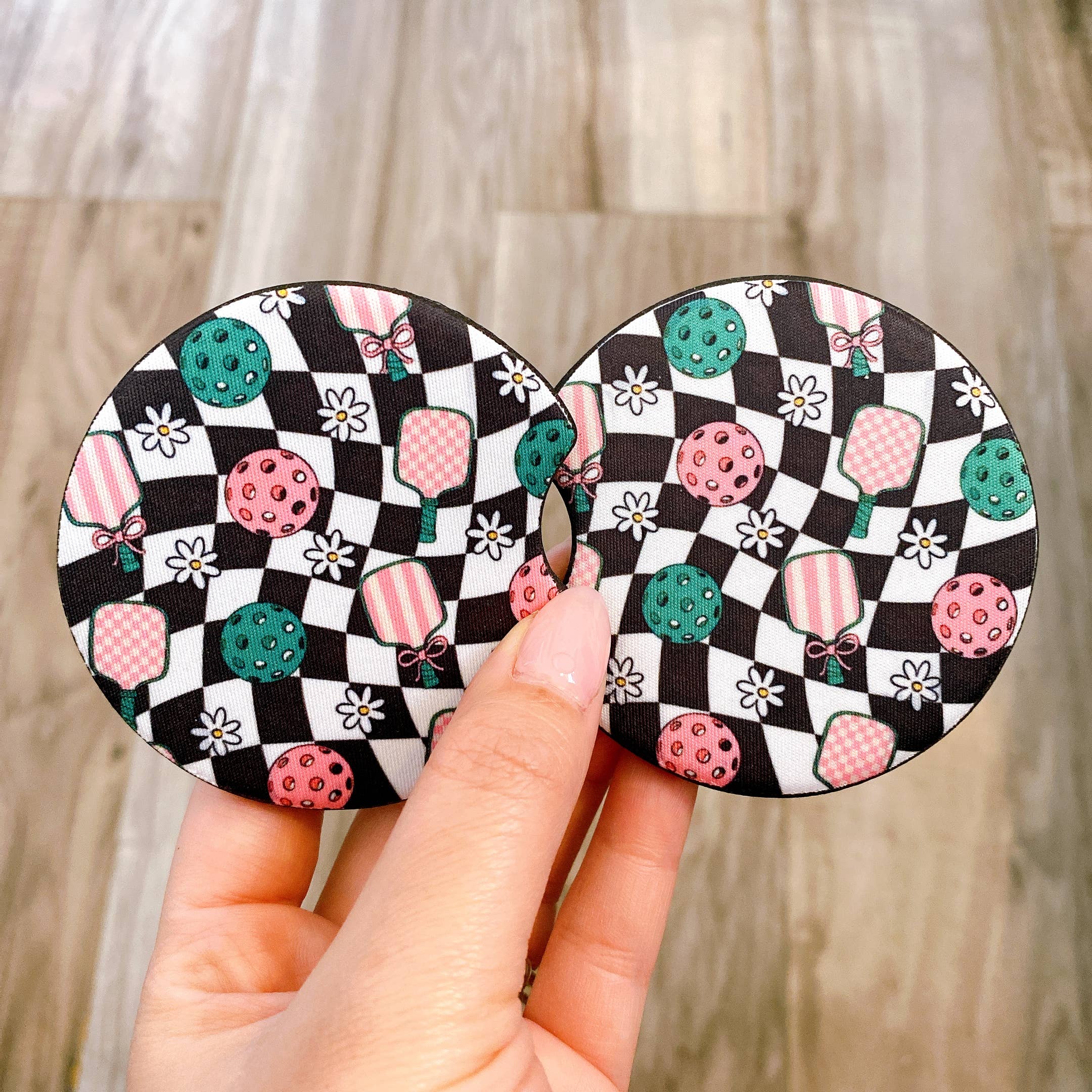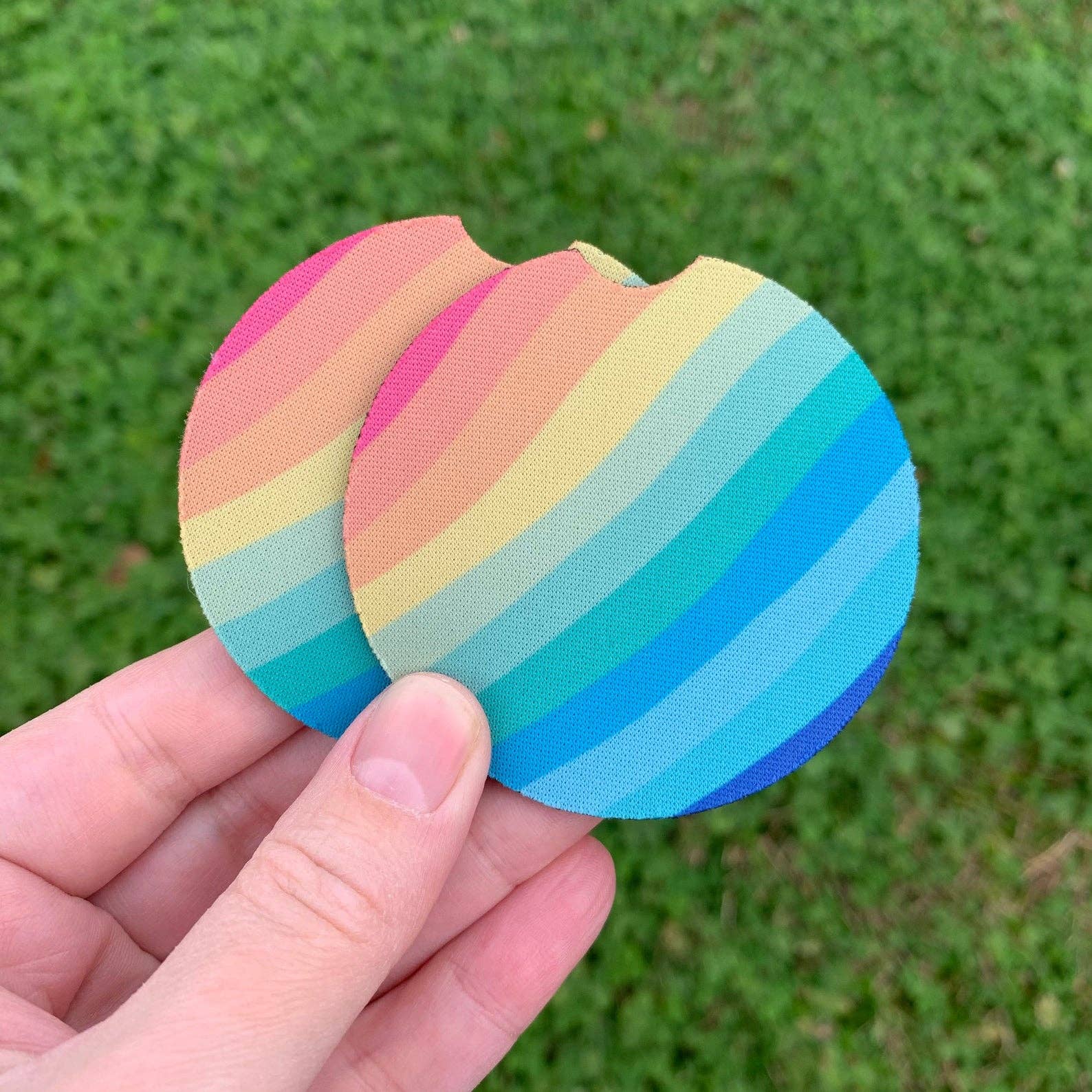 Our car coasters come in sets of two and are printed to order in house using high quality materials and processes. The print is permanent and will not fade, crack or peel. There may be slight differences in each print since they are hand made. The car coasters are made of neoprene material. They have a soft polyester front with a black rubber backing. They measure 2.56” in diameter and are .22” thick. Print is on front side only.