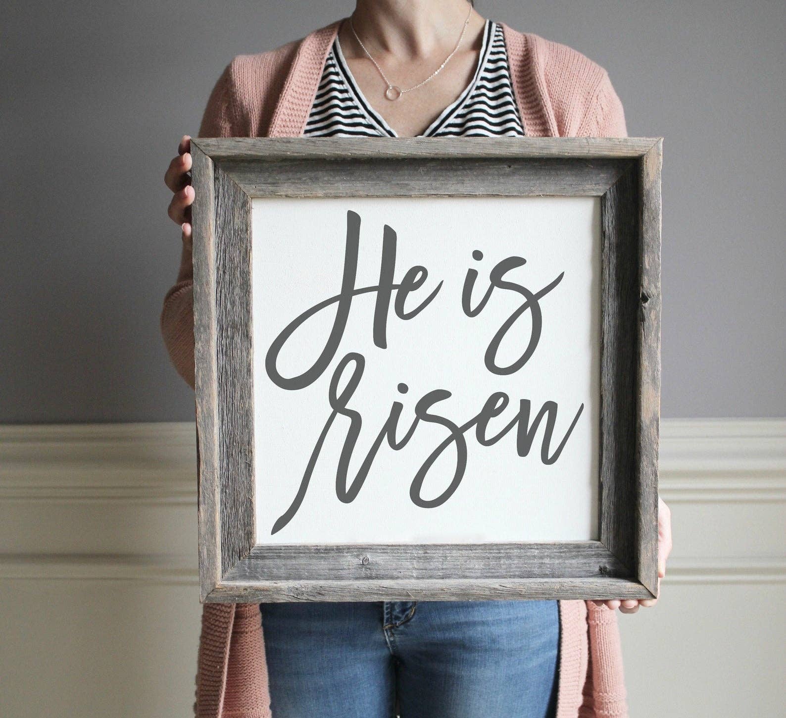 Each farmhouse sign is handmade to order on quality solid wood. Each piece may have its own natural imperfections. The barnwood frame is manufactured from 100% authentic weathered wood allowing the rustic charm of the natural knots, nail holes and color variations to show through. Ready to hang with attached hardware. Frames are custom made and will vary slightly from the picture due to the nature of the wood. DIMENSIONS - Full Dimensions: L: 14.5" W: 14.5" - Artwork Dimensions: L: 12" W: 12"
