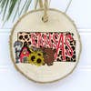 2.5 Inch - 3.5 inch wood slice ornament. Ornaments are real wood, and are mostly round, but will vary in shape and in size. Each one is unique! Ornaments are printed with high quality ink - no vinyl or stickers are used. Ornaments Includes twine hanging string.