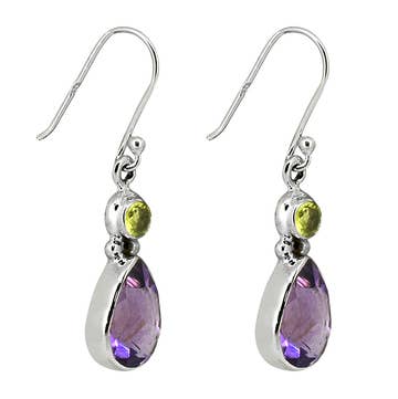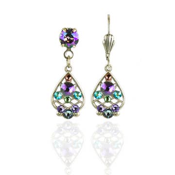 Bounce and sparkle combine in these vintage inspired dangles. Featuring open teardrops with scrolled foot and open netting details, and lush crystal accents, these earrings add effervescence to any look. Made in the USA with lead/nickel free antiqued silver plated brass findings. Also available with a coordinating crystal clip or post. Earring wires/clips made of nickel/lead free antiqued silver plated brass. Posts made of surgical steel. Crystal Colors: iridescent smoky lavender, blue violet, cool green, blush rose, denim blue Measures Approximately: 3/4" L x 7/16" W Style# ES3167PDS Coordinating Style: NS3167PDS Fall