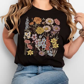 Bumble bee art with flowers printed -4.2 oz. (US) 7 oz. (CA), 100% airlume combed and ringspun cotton, 32 singles. -Retail fit. -High quality DTF printed -Unisex sizing. S : Chest 18" / Length 28" M : Chest 20" / Length 29" L : Chest 22" / Length 30" -Coverstitched collar and sleeves. -Shoulder-to-shoulder taping. -Side seams. -Tear away label. -USA Strong. -Assembled in Honduras of US components.