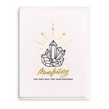 Manifest a birthday full of magic and wonder with our "Manifesting You a Magical Birthday" card. Perfect for anyone who believes in the power of manifestation, this card brings a touch of enchantment to their special day. Printed in San Diego, CA, this A2 folded card features letterpress printing on luxurious 100% cotton-rag, tree-free paper with eco-friendly soy-based inks. Product Features: A2 folded card (4.25" H x 5.5" W) "Manifesting You a Magical Birthday" design for a unique birthday wish Letterpress printed with soy-based inks Printed on 100% cotton rag or cotton-blend tree-free paper Blank inside for your personal message Includes 1 envelope (color may vary) Packaged in a crystal-clear sleeve Made in San Diego, California A magical, eco-friendly, and thoughtful way to celebrate someone’s special day!