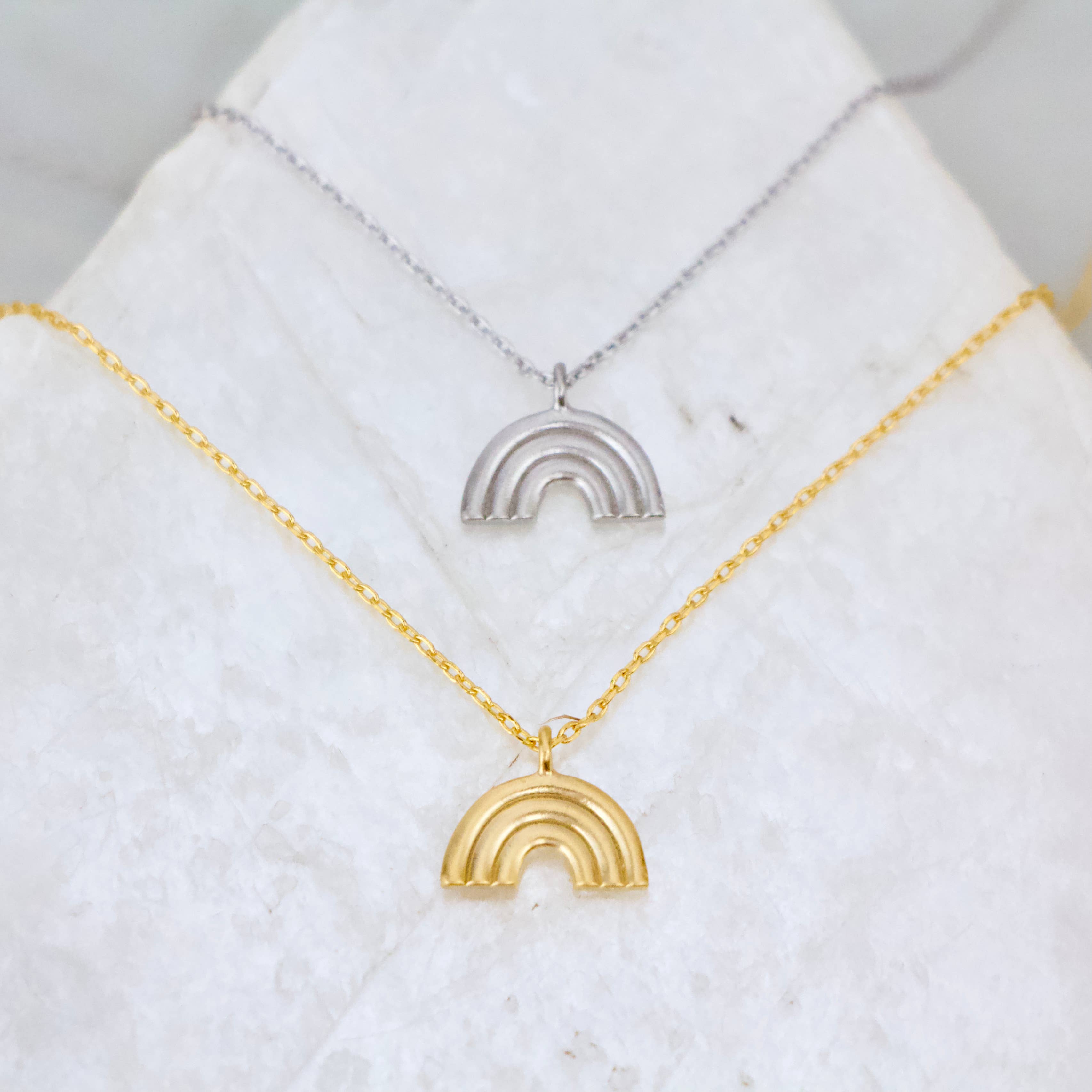 Personalized Birthday necklace gift for her, Rainbow initial necklace 14k Gold vermeil, Sterling silver necklace A thoughtful personalized rainbow necklace gift that is sure to fill her birthday with magical moments and rainbows!! All components are handmade with 14K gold vermeil & sterling silver. A high-quality piece of jewelry that she will treasure for many years to come. - Necklace is 18” long with an adjustable ring at 16”. - Rainbow charm measures .45" in diameter. - Tiny initial charm measures .24" in diameter. - Beautifully packaged in our custom designed jewelry box with a blank greeting card and jewelry care instructions. - If you would like to leave a gift message, select "This order is a gift" and then "Add gift message for free" at checkout. About 14K gold vermeil: Gold vermeil jewelry contains a thick layer of real gold. It is a durable, long-lasting precious metal with the prettiest light gold tone.