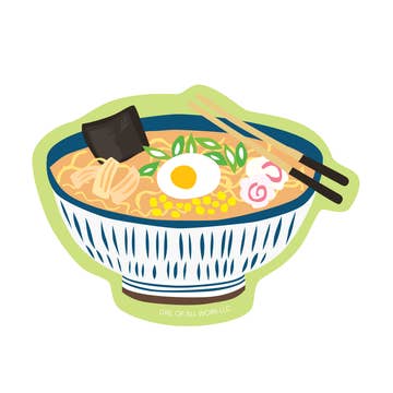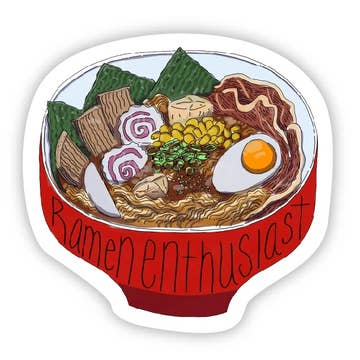 • 3 inch die cut matte vinyl sticker • Durable, UV protected, waterproof, and long lasting • Designed and printed in Portland, Oregon There's a full moon tonight and it's time for a bowl of savory ramen noodles! Topped with Japanese chashu pork, shiitake mushrooms, scallions and a soft boiled egg 💛