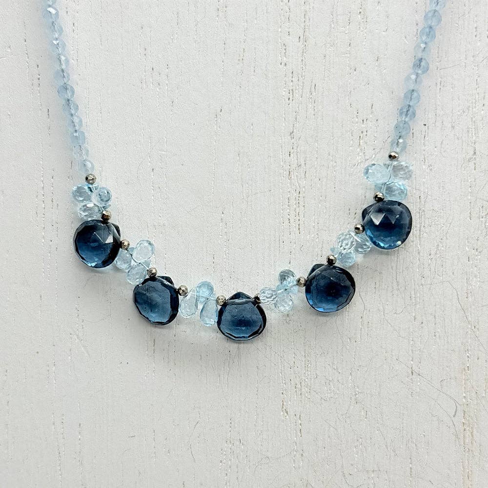 Our beautiful Aquamarine Quarter Ruffle necklace! Expertly handcrafted, this beautiful necklace showcases hand-cut Aquamarine hearts accented with delicate faceted Citrine and Pyrite. Necklace secures with a Gold-filled toggle clasp. Length 16" Stones Aquamarine, Pyrite Handmade in Connecticut, USA