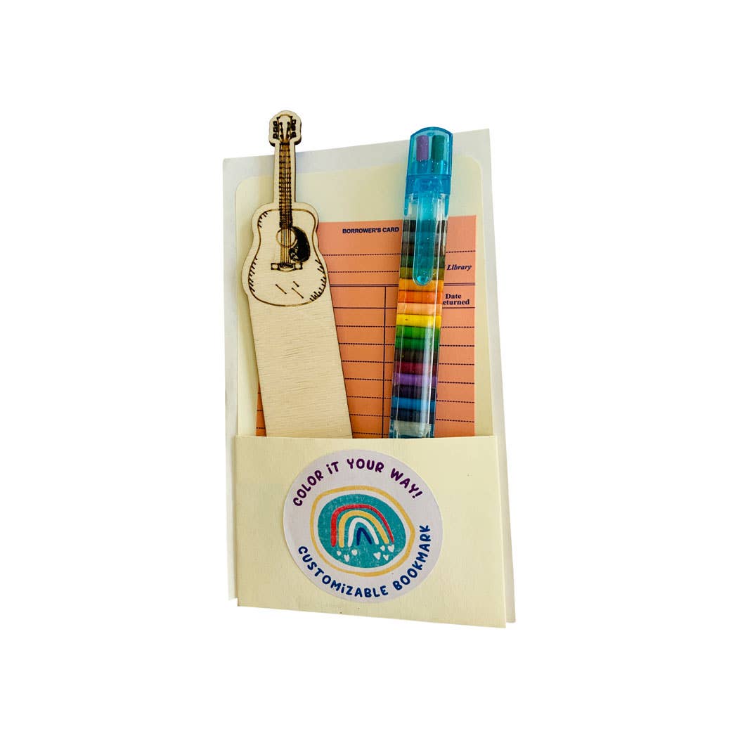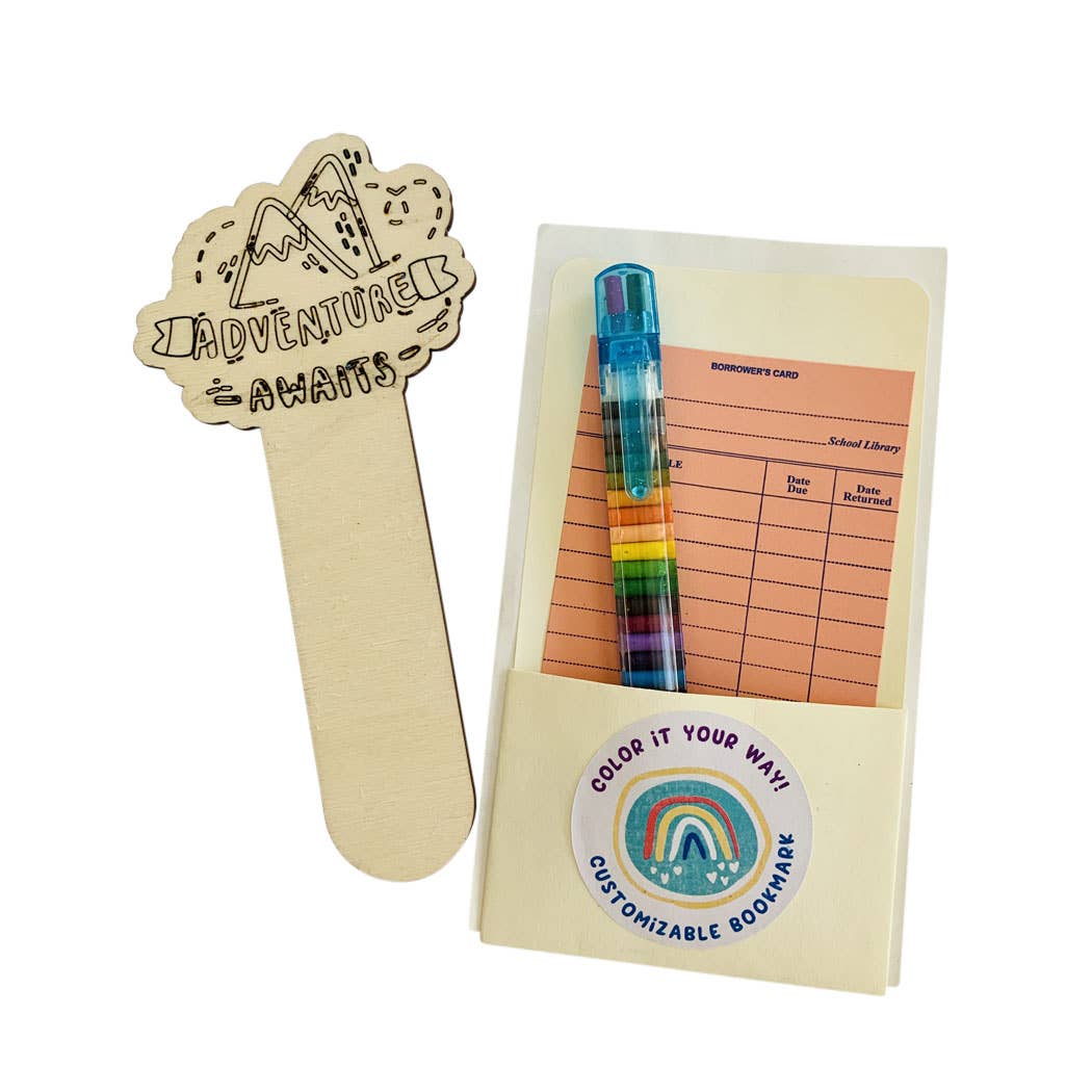 Kids and Adults alike will fall in love with Sadie's Moon's newest addition which are our DIY color your own wooden bookmark collection. The bookmarks measure 7" in length and comes with a 20 color transparent stacking color crayon. All is neatly packaged in a library book insert with library card inside a cellophane bag. Durable solid maple plywood. It's a cute companion for your favorite reader!