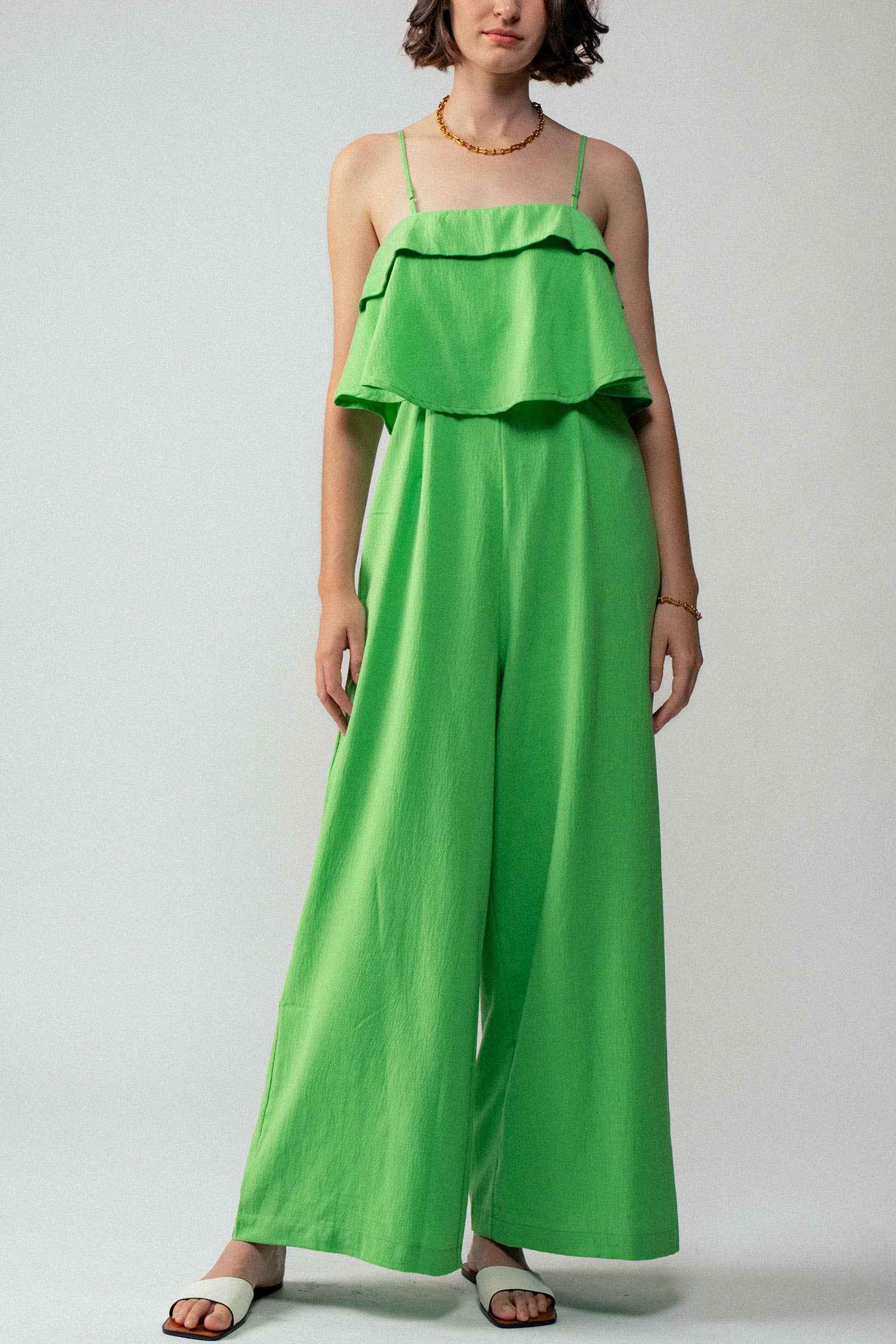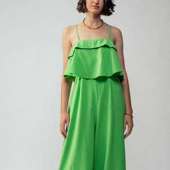 Classic with a flirty flair. The Manuela Jumpsuit is your new classic go-to. A mock meets a gathered seam that's framed by flirty ruffle cap sleeves. IT maintains a sleek fit, leading to wide leg pants. The back features covered rouleaux buttons at the neck and a keyhole cut out topping a zipper closure. - Cap sleeves - Keyhole - Rouleux buttons - Zipper closure - Comes in 4 colors Size + Fit - Model is 5'9" and wearing size XS - Measurements taken from size S - Waist: 13 3/4" - Inseam: 32 3/4"