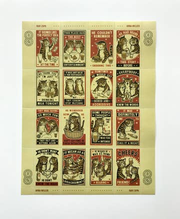 These drinking cats get into all sorts of tricky situations. Digitally printed on lickable, gummed paper and pinhole perforated by hand on vintage machines, 16 stamps per 8.5 x 11" sheet. Designed by Ravi Zupa & Arna Miller. Packaged in an eco-friendly, vegetable-based cellulose protective sleeve with chipboard backing. Please Note: This is not actual US postage, but a series of artist-created stamps intended for both embellishing correspondence and collecting.