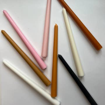 Our taper candles are handcrafted and handover-dipped for a superior depth of color. The interior of the candles remain white ensuring a clean and dripless burning that lasts approximately 11 hours. Sold as pairs 7/8" Base, fits any standard taper holder Lead Free Cotton Wicks Food Grade Paraffin Wax Handcrafted in Canada Note: Keep away from drafts. Exposing your tapers to a draft may result in some dripping and/or smoking. Keep wick trimmed to 1/4".