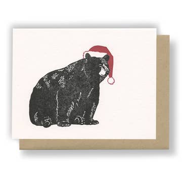 This letterpress-printed card features a hand-carved linoleum block print of a black bear in black ink, and a hand-illustrated Santa hat is printed in red ink. Blank inside. Includes kraft paper envelope. A2 size.