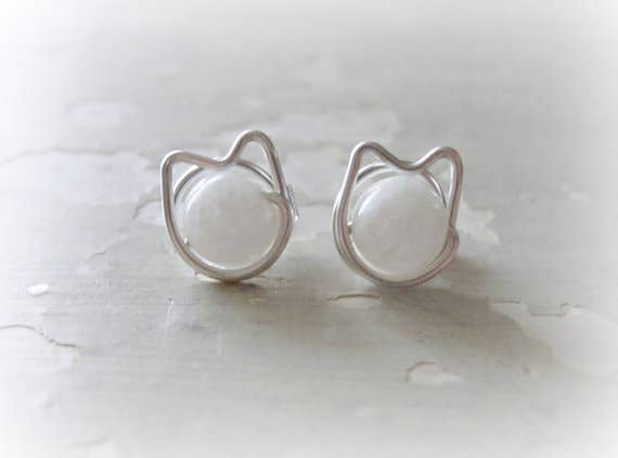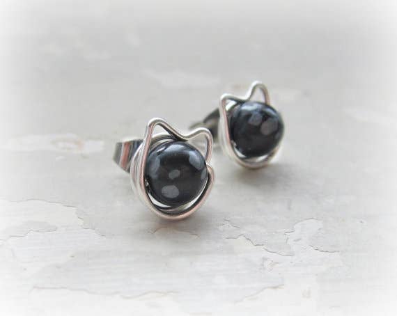 Hand formed and wire wrapped sterling silver spotted cat stud earrings. 6mm smooth and round spotted Dalmatian Jasper stones are securely hand wire wrapped and formed with solid sterling silver wire. A base metal ear clutch finishes the earrings. These earrings are sealed with a museum grade micro wax to prevent tarnish.