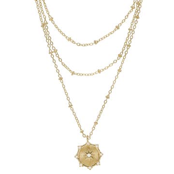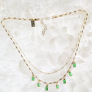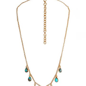 Triple strand beaded chains with jade teardrops. The bottom chain hangs 20".