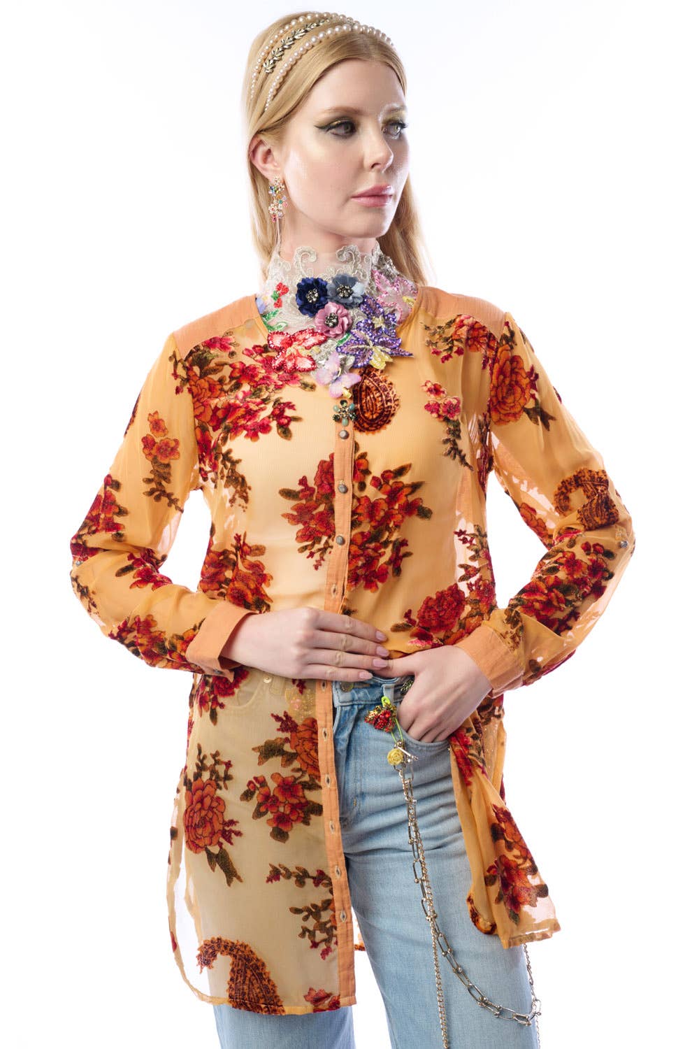 * ED25I628 * Denim coat with removable brooches, brass buttons on the front and the pockets, 2 front flap pockets on top and 2 side pockets, embroidered trim on sleeve cuffs * Denim blue * Hand wash warm with like colors (remove the brooches before wash) * Line dry * Self fabric: 87% cotton, 13% polyester, lining: 97% polyester, 3% spandex
