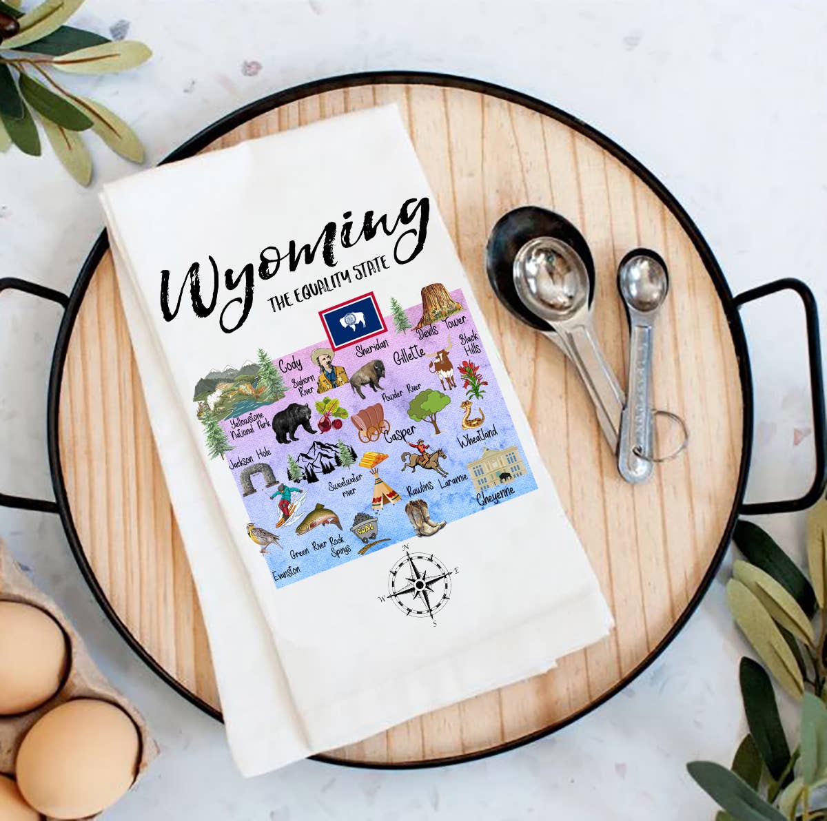 This towel features a fun design of Wyoming and its surroundings! Reads "The Equality State est. 1890" under Wyoming map style illustration that says "Greetings from Wyoming". Cotton flour sack tea towel 1-color screen printed Towels measure 24 x 28, printed image measures 19 x 23. All images, products and designs © Noteworthy Paper & Press
