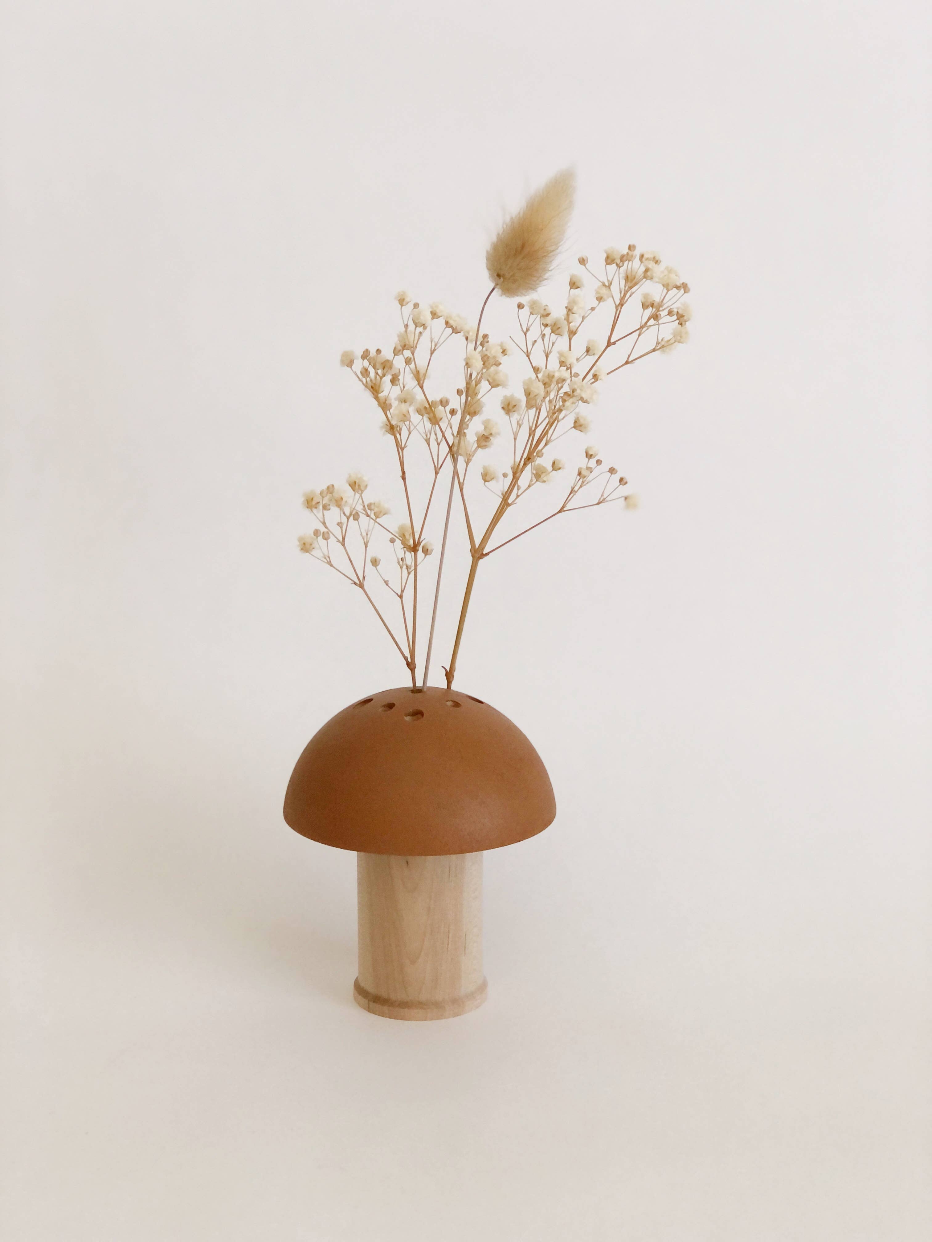 These mushroom vases are the perfect size for displaying dry flowers, enjoying cut flowers from the garden, and small, foraged treasures (feathers, seed pods). Create a minimal statement from a single specimen or artfully design a full arrangement (Ikebana style) to fit your decor and color favorites. The possibilities are endless! What is Ikebana? It means living flowers, artfully arranged. Selected individual flowers (dry and/or real) are arranged in a subtle, sophisticated and minimalist way to highlight the particular blooms which are chosen. Makes a great gift for the flower, plant or nature lover. Each mushroom is hand-drilled with 7 holes, hand-painted and made of solid wood. Available with dried flowers or without. Does not hold water. Curved Base dimensions: 2 1/2" wide x 3 3/8"tall