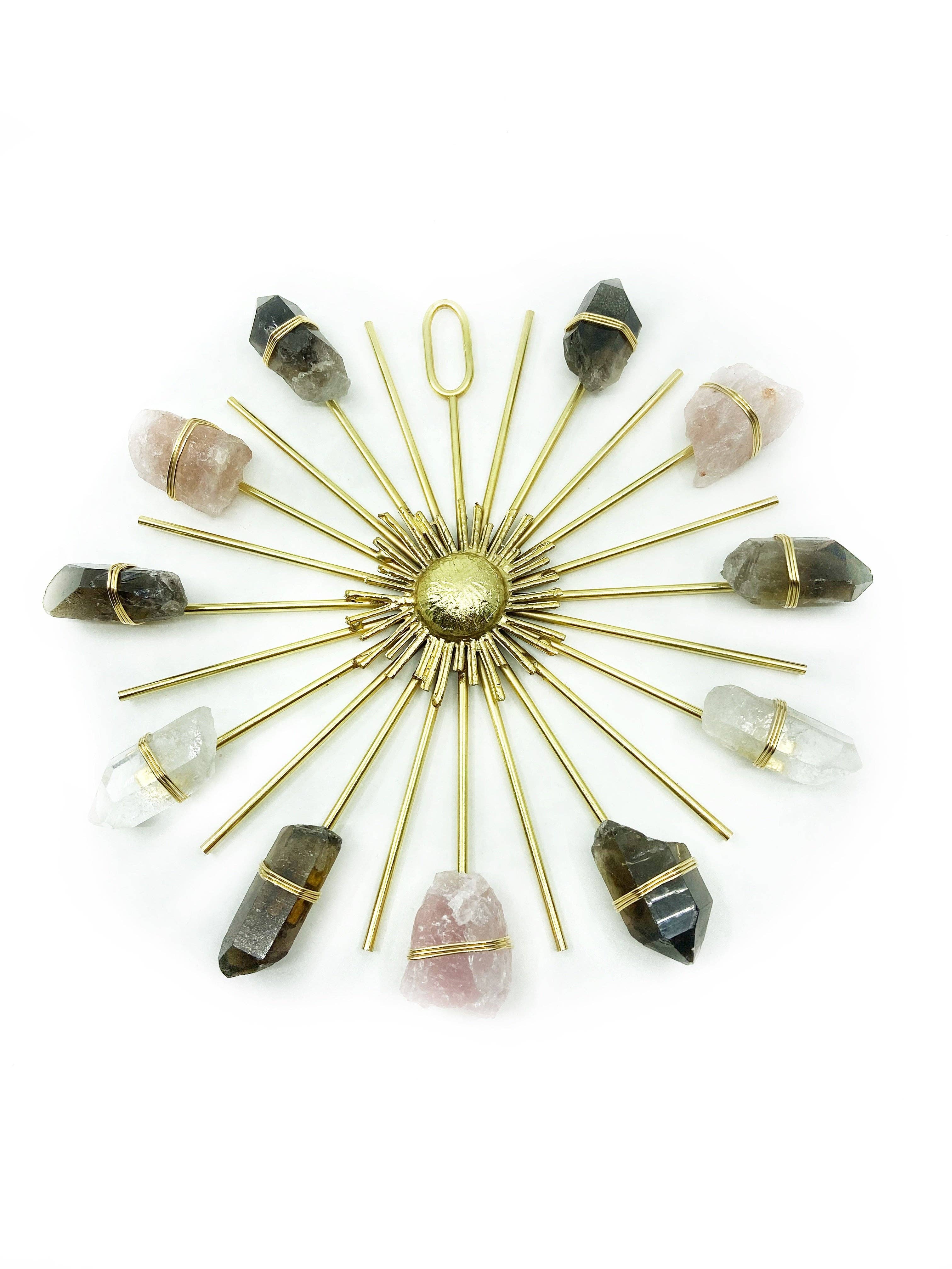 Here comes the sun—radiating joy, love, and healing. This Rainbow Sunburst Crystal Grid is designed to channel energy outward like lightwaves, amplifying your intentions and brightening your space. Handcrafted on a cast metal base and wrapped with luminous crystals, it's a powerful tool for manifestation and energetic alignment. ☪ Sunburst shape symbolizes expansion, vitality + radiant energy ☪ Features: – Fuchsite for heart healing + emotional renewal – Blue Calcite for peace + relaxation – Pyrite for luck, protection + confidence – Clear Quartz for strength + energy amplification – Citrine for joy + abundance – Rose Quartz for love, peace + self-compassion ☪ Ideal for altars, meditation spaces, or joyful gifting ☪ Alternate keywords: sunshine altar grid, joyful healing decor, chakra crystal grid, heart-opening energy art Handmade with love in our NYC studio. SKU: A1008 Dimensions: 8" L x 1" W x 8" H | Weight: 7 oz