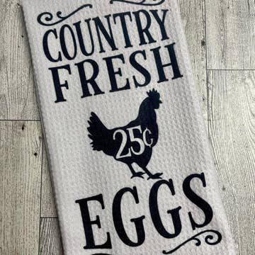 This farm and chicken inspired towel is great addition to any kitchen and also makes a perfect gift for friends and family! TOWEL DETAILS: - Measures approximately 16”x 24” - Made of 80% Polyester and 20% Polyamide. - Design is permanently printed - Individually packaged in cellophane sleeve and ready to be gifted - It is called a waffle weave because the towel has raised looped edges on the surface of the towel in the shape like that on a delicious Belgian Waffle. These “pockets'' that are created hold water while the surface of the cloth stays dry making it an exceptional drying towel! The raised looped edges on this lint free towel make it great for all around use, while also being great on glass.